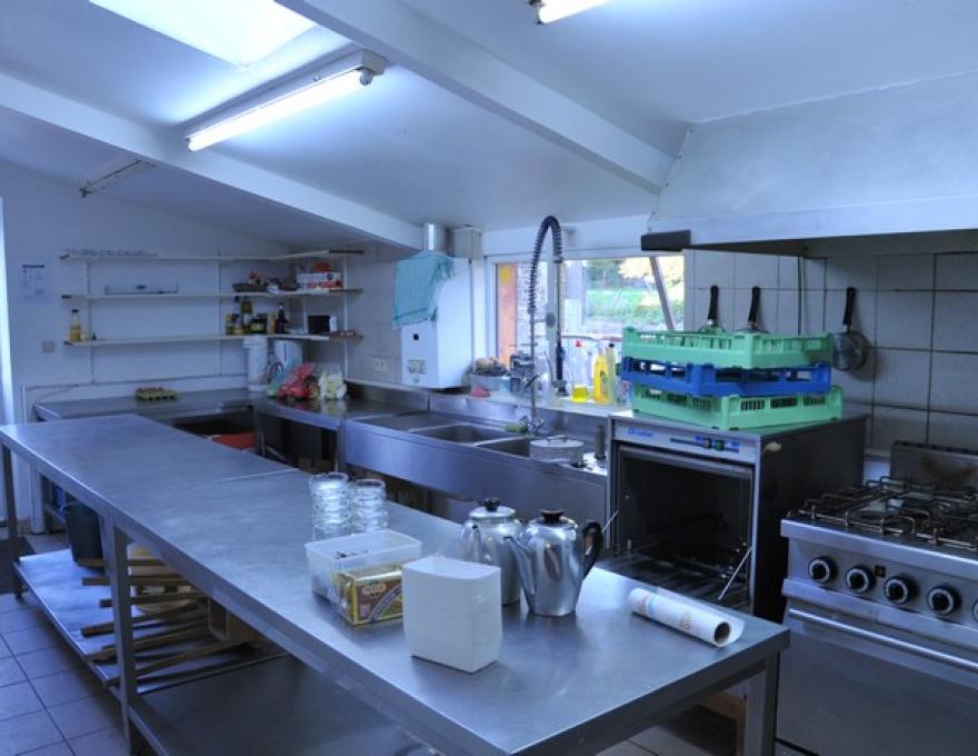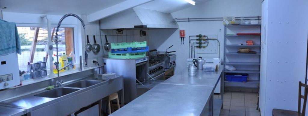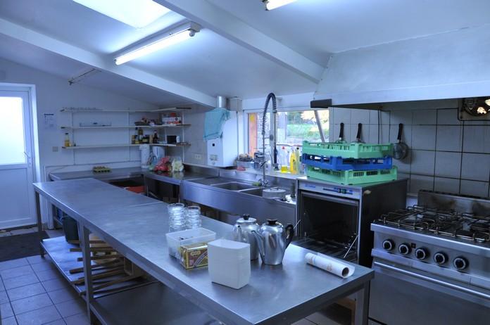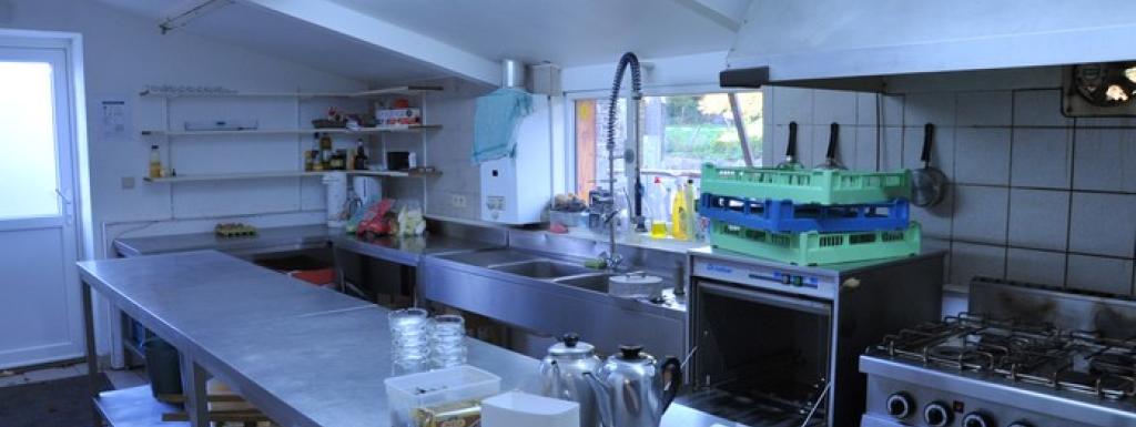 La salle est pourvue d'une cuisine professionnelle entièrement équipée (cuisinière et four à gaz, four à micro-ondes, frigo, congélateurs,...).