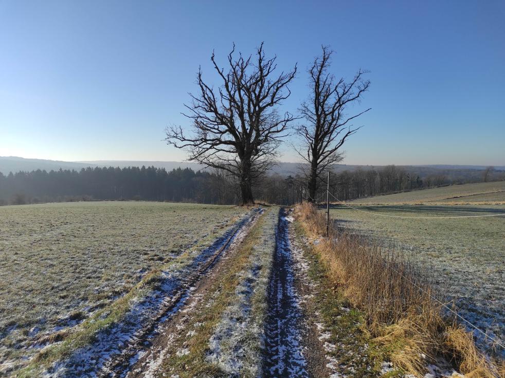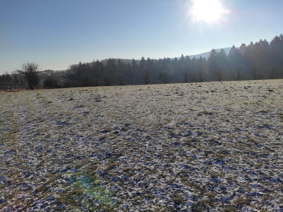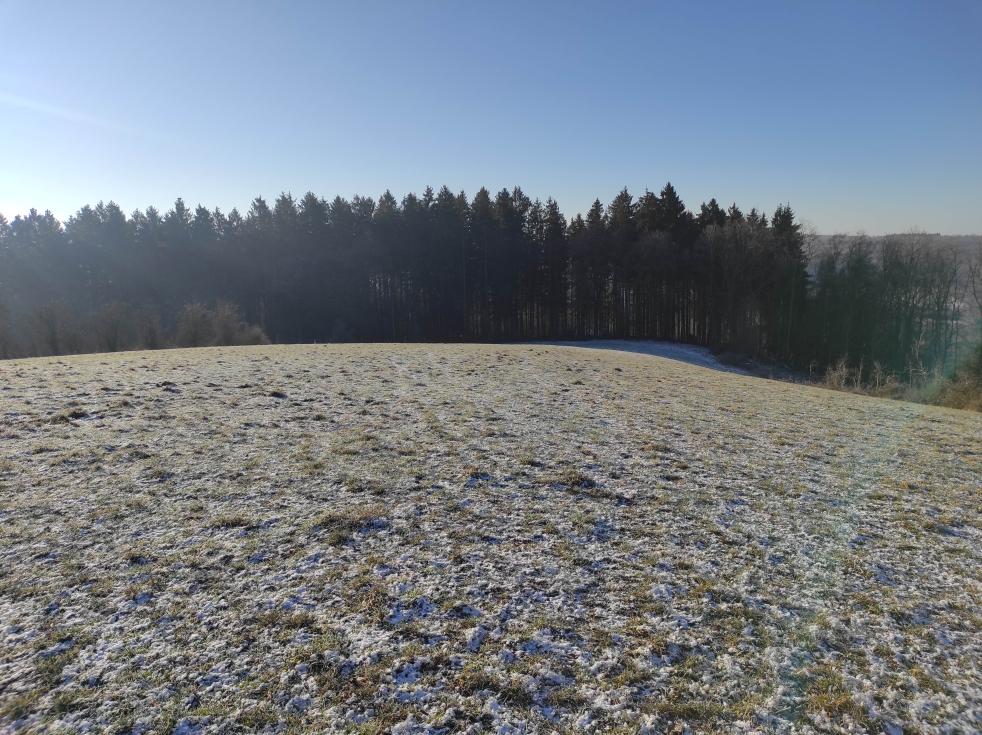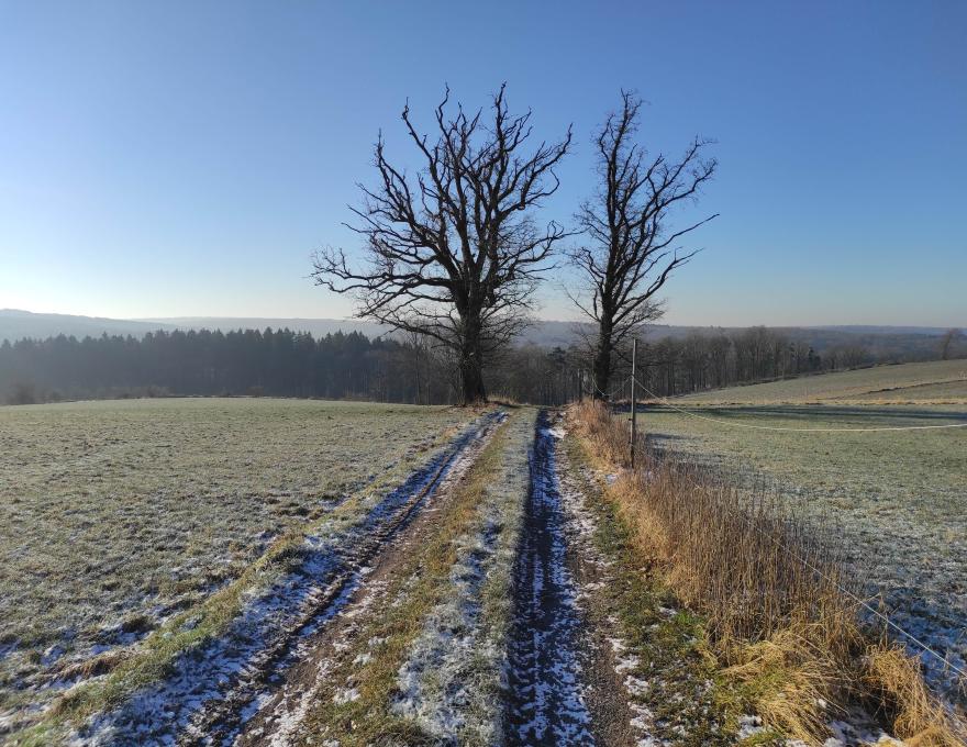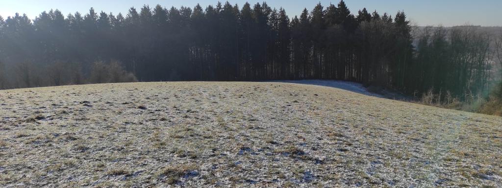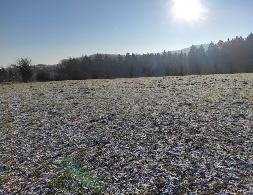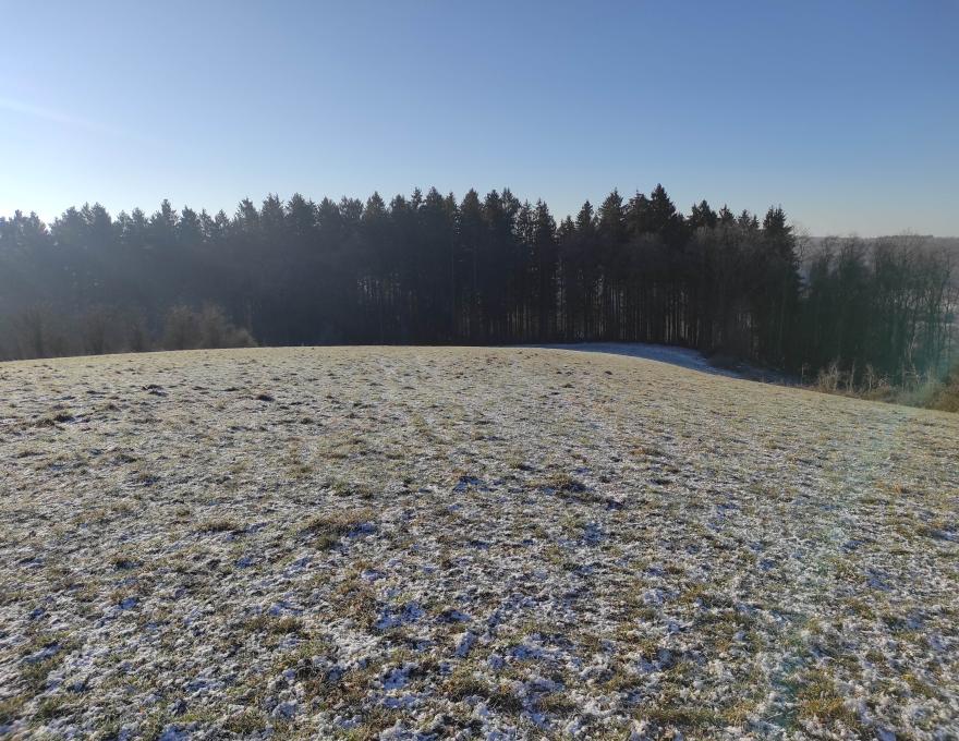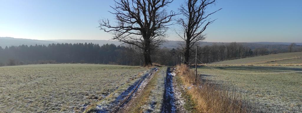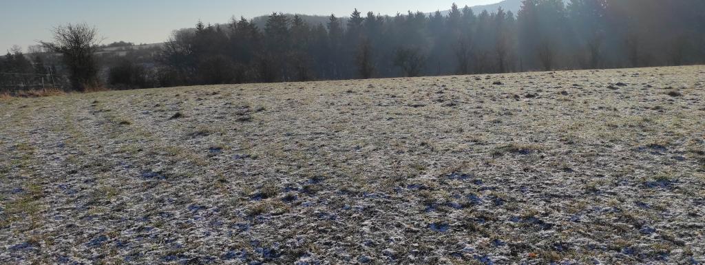 Prairie isolée sur les hauteurs de Sohier, bordée par un bois et proche d'un petit cours d'eau.