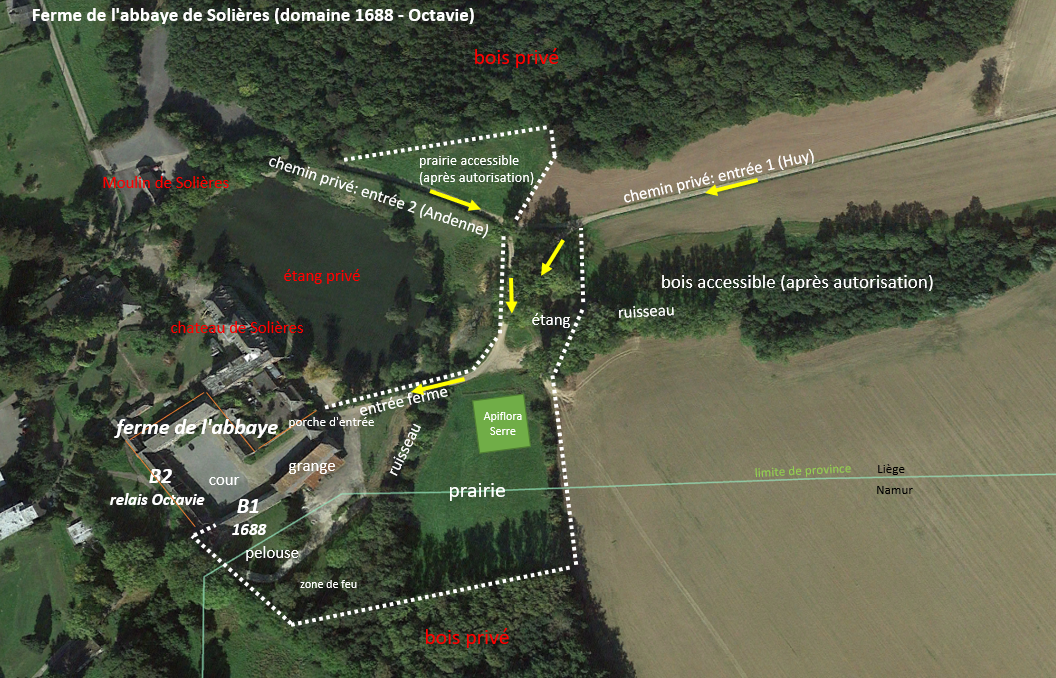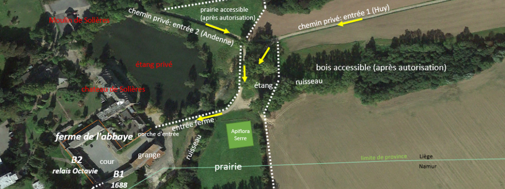 La location se situe en Ardenne Condruzienne à la limite des provinces de Namur et Liège (entre Andenne et Huy). La propriété se trouve à plus d'un kilomètre du premier axe routier Huy-Ohey, isolée du village, près du château et du moulin de Solières. Son accès se fait par une voie privée. L'endroit du camp est en zone agricole entouré de cultures et de bois, traversé par 2 sources de la Solières, alimentant un étang situé à l'extrémité d'une bande boisée de 4 ha.