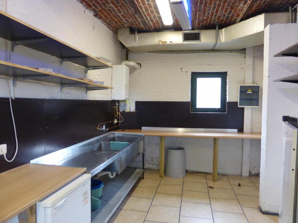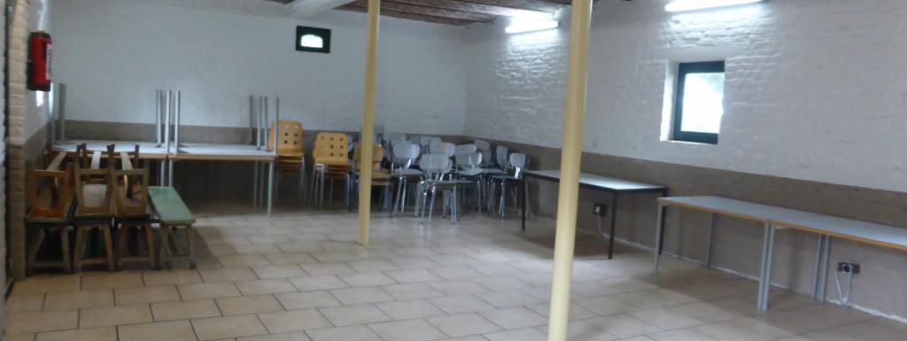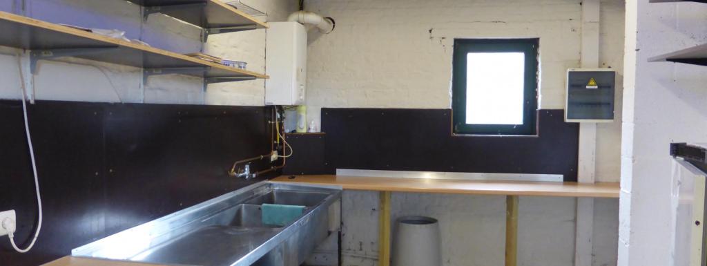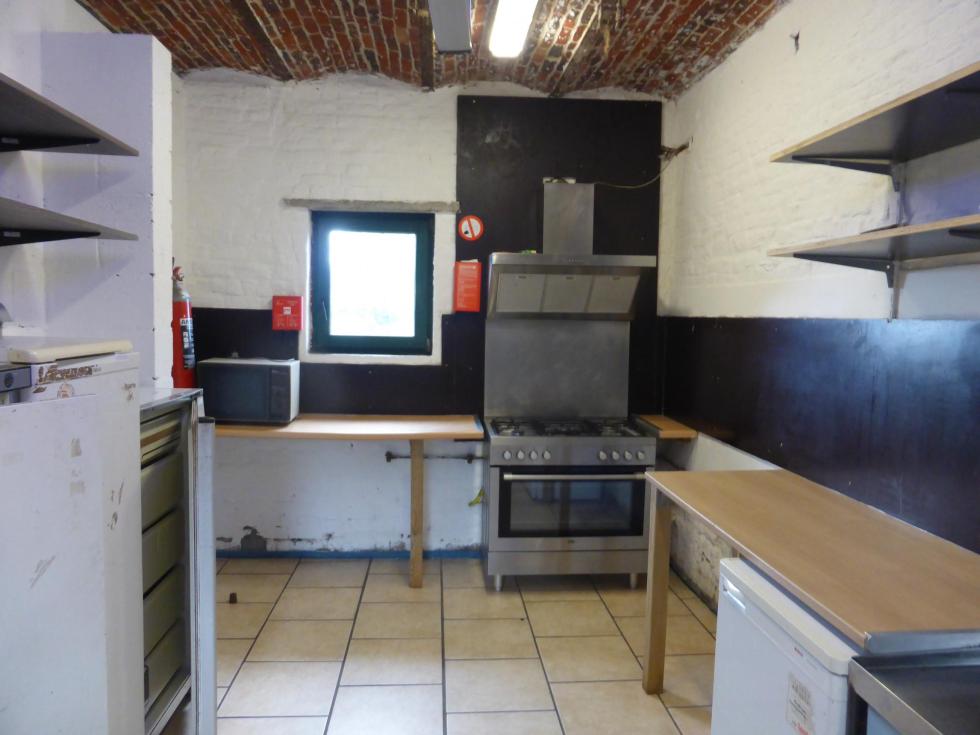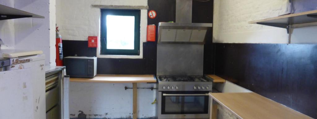 au rez-de-chaussée : une grande pièce avec des tables et chaises en suffisance, une cuisine avec une cuisinière au gaz et un grand four électrique, un four à micro-ondes, un surgélateur et des frigos mais pas d'ustensiles de cuisine ni de vaisselle