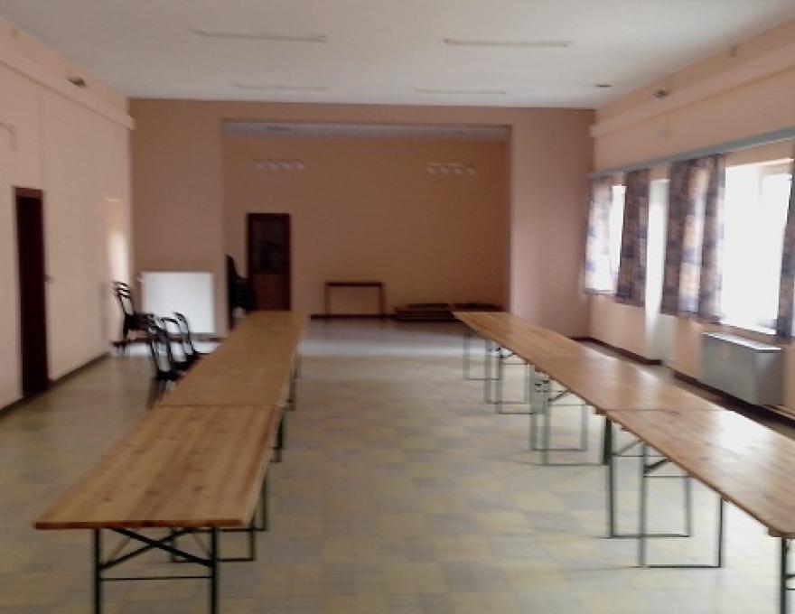 Salle meublée (26,50m x 7m) contenant 1 bar avec comptoir frigo