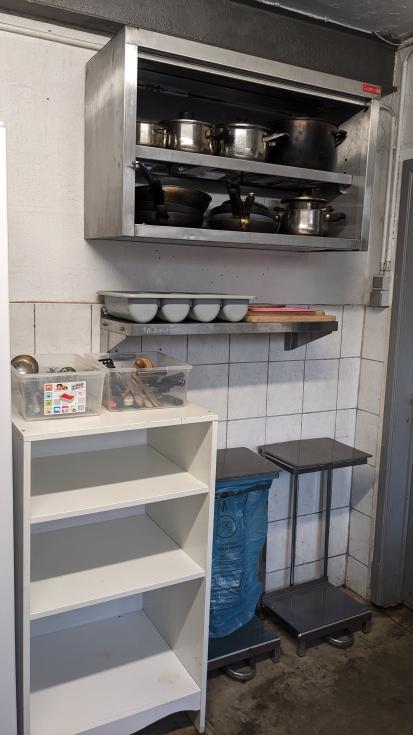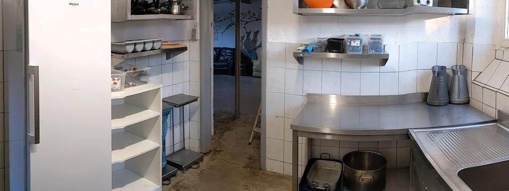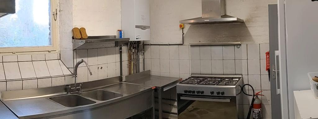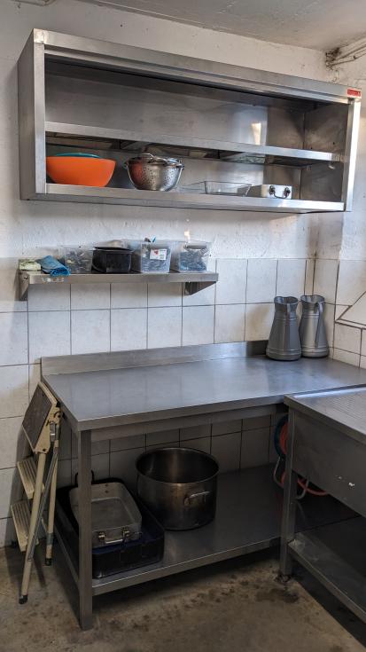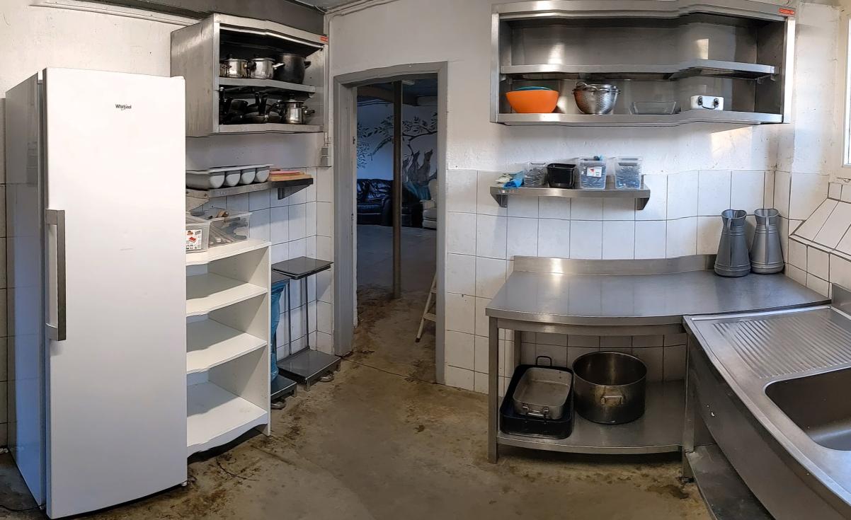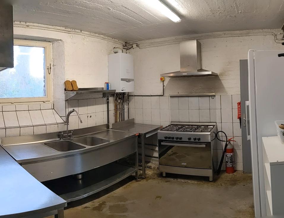 Rez-de-chaussée : hall d'entrée ; pièce-réfectoire 2 radiateurs ; cuisine inox avec cuisinière à gaz et four, frigo et congélateur, ustensiles de cuisine, couverts, assiettes, verres, matériel de nettoyage ; salle d'eau avec 2 radiateurs, 3 WC, 3 douches, 2 bacs-éviers (eau à température).