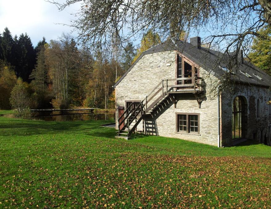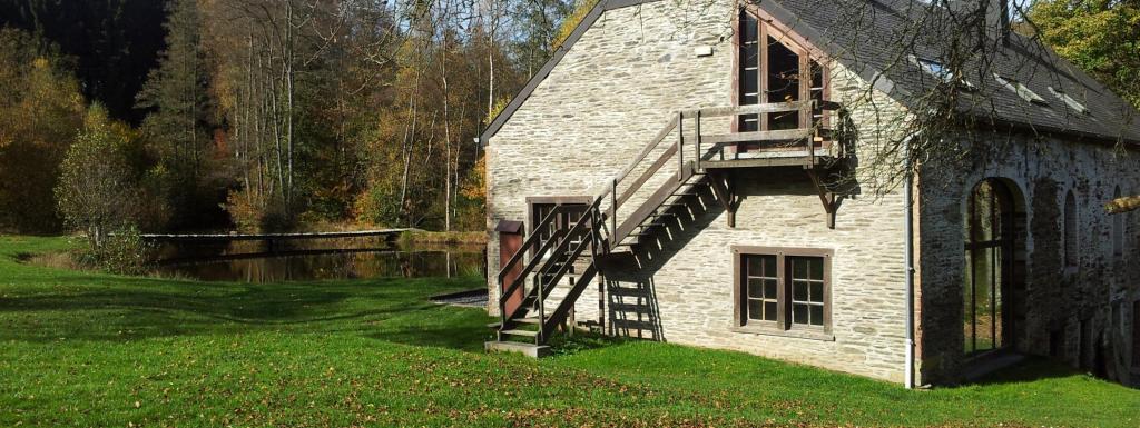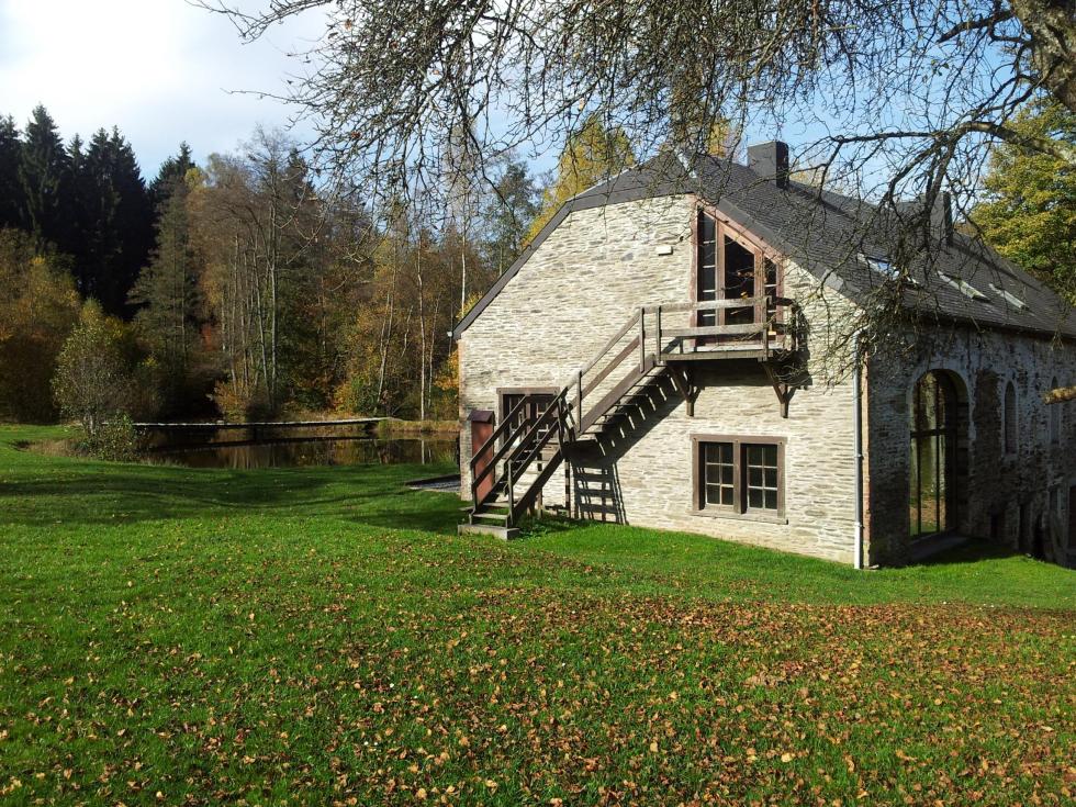 Le moulin se trouve en bas d'une grand prairie, à côté d'un étang au beau milieu des bois.