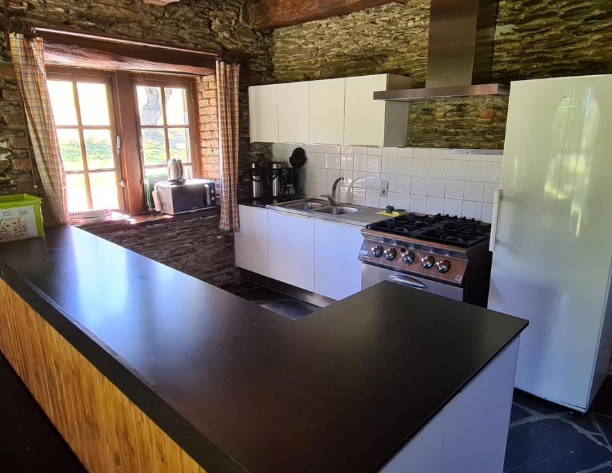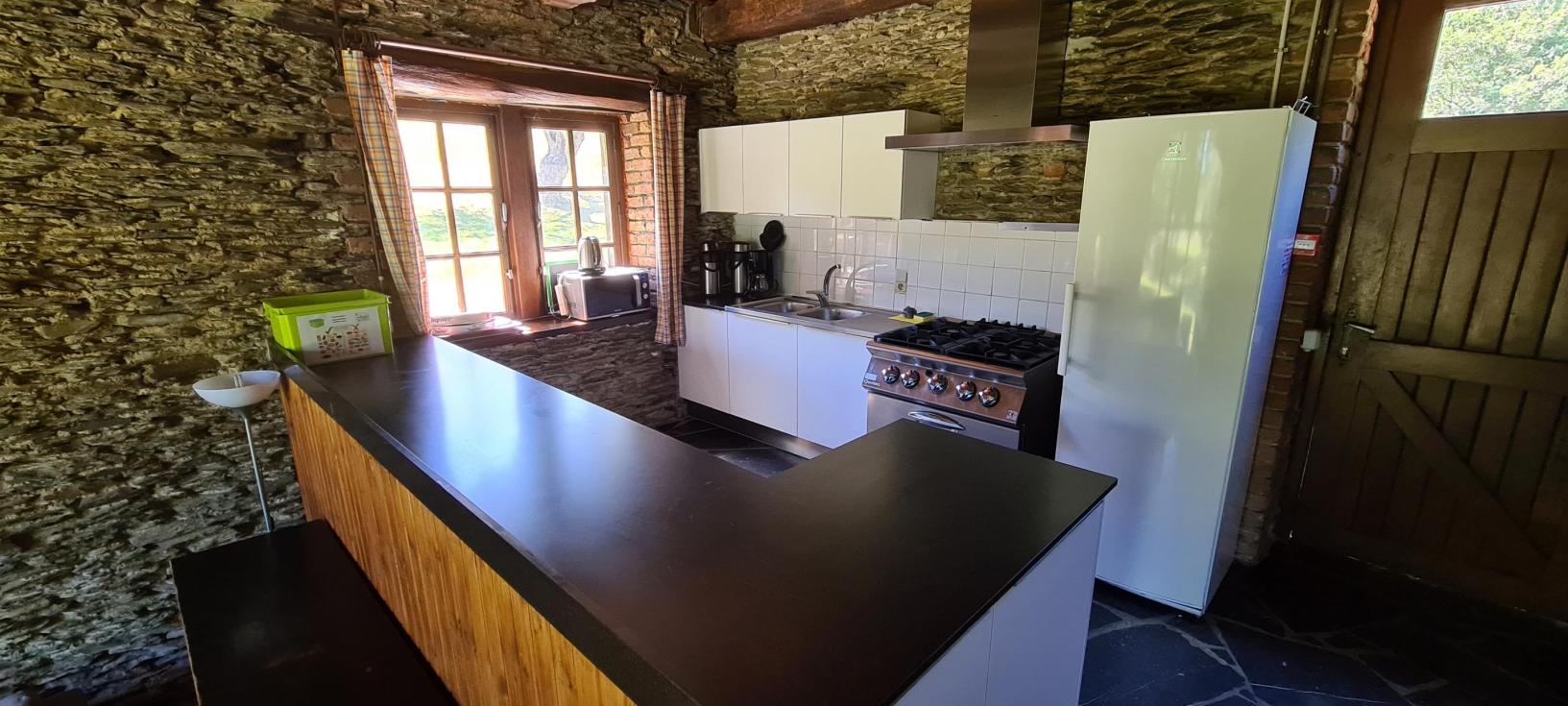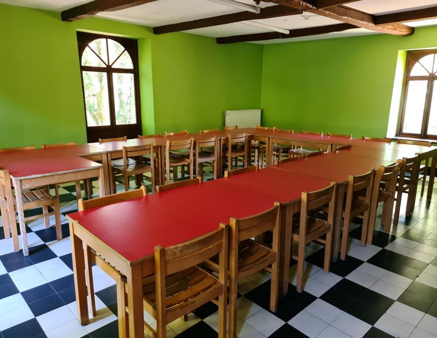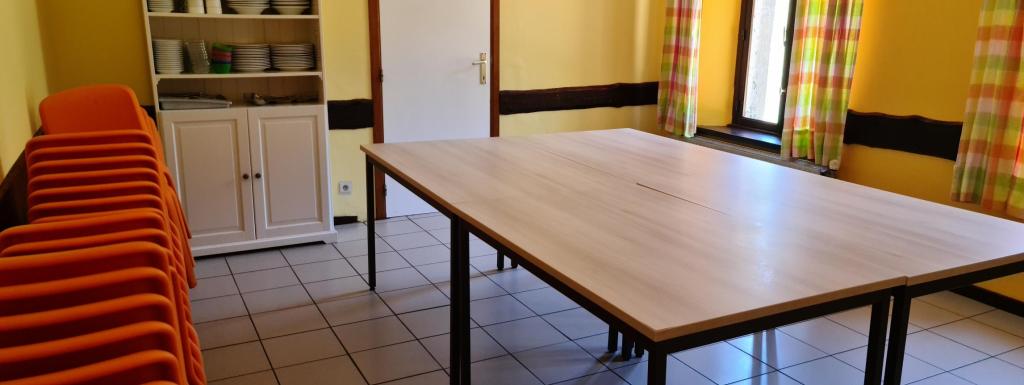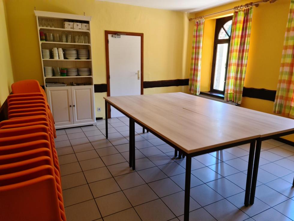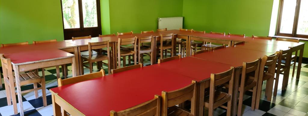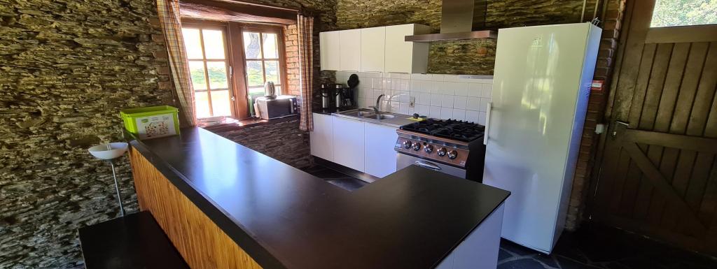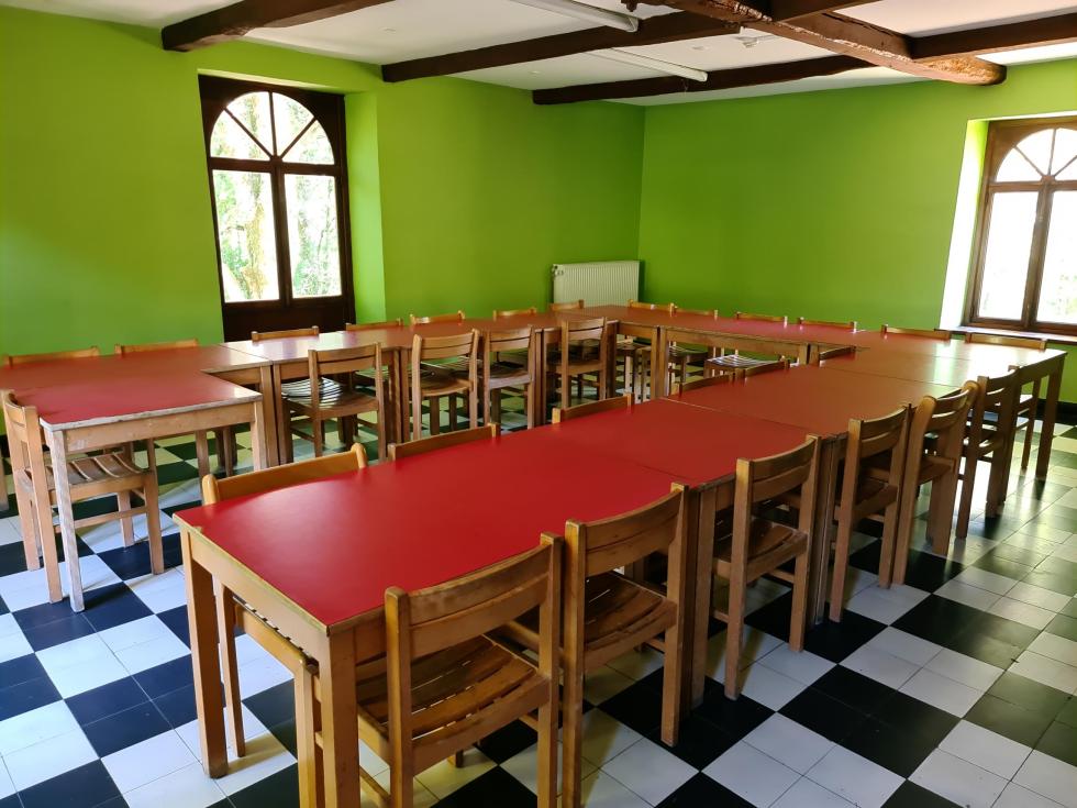 une grande salle de 60 m² avec feu ouvert, une salle à manger, une cuisine équipée avec batterie de cuisine et vaisselle, un salon avec feu ouvert, 3 douches et 1 toilette, une chambre pour 4 personnes avec lavabo, chauffage central au mazout.