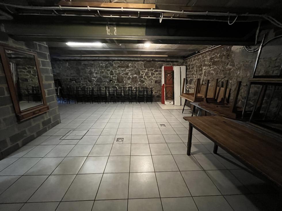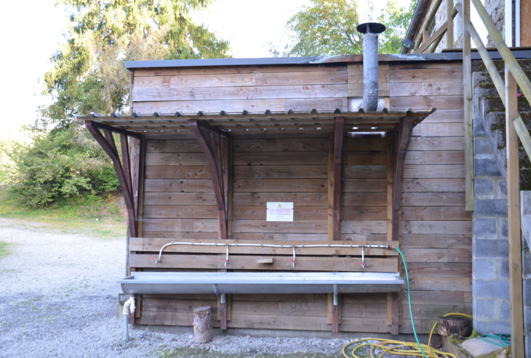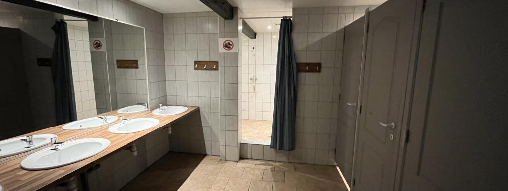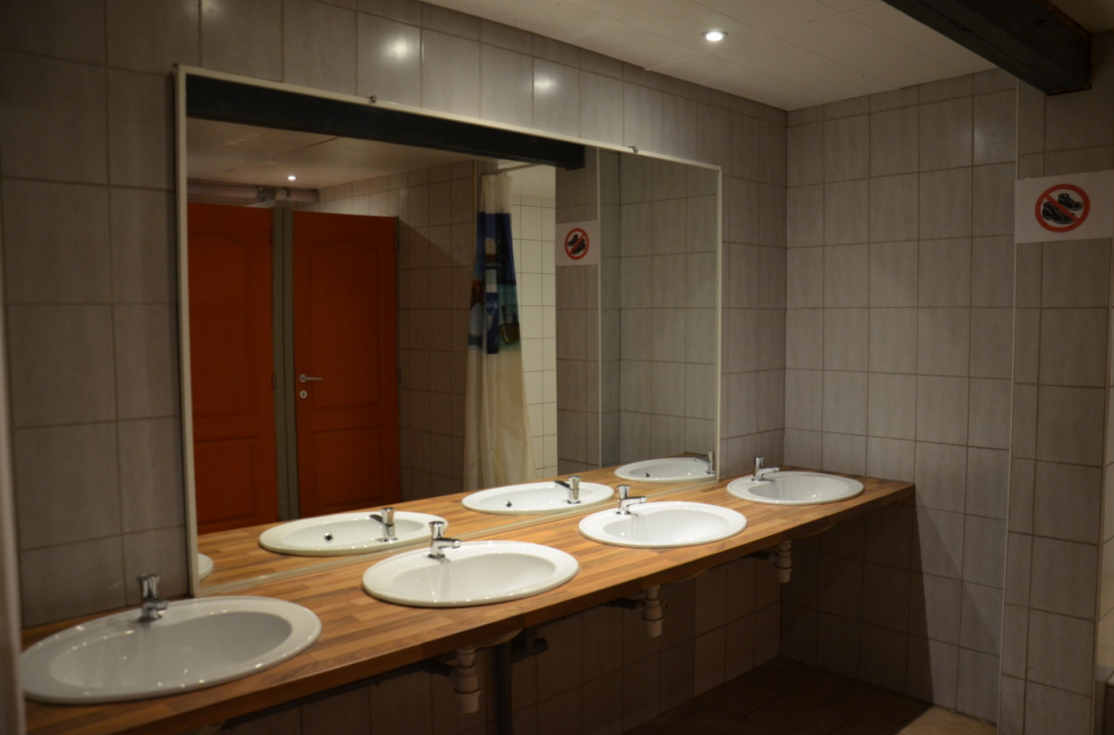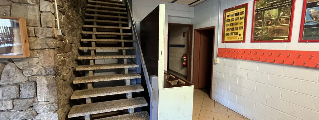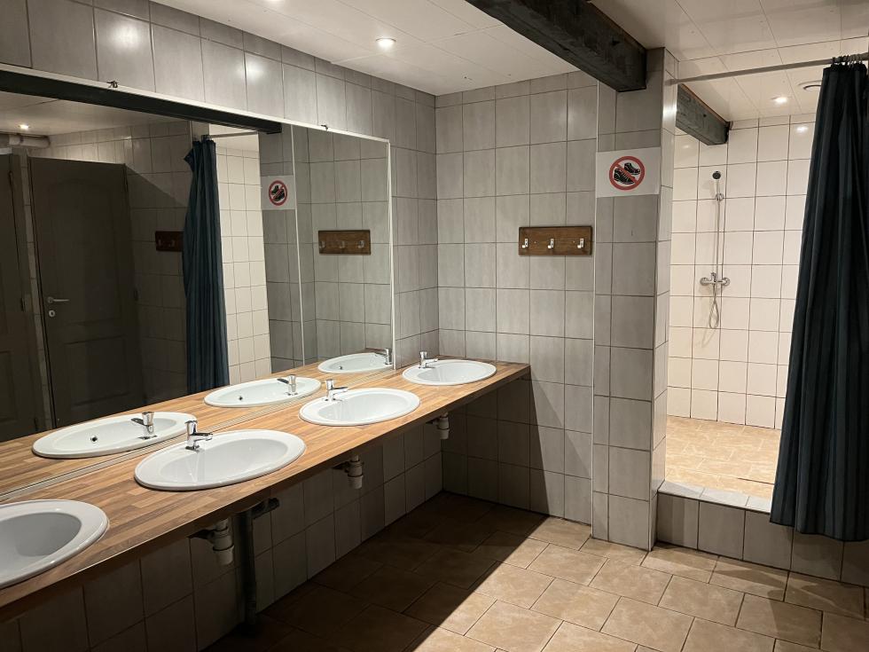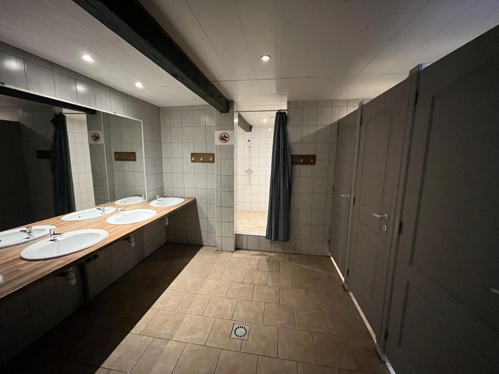 Le bâtiment : • Au rez-de-chaussée : une grande salle-réfectoire de 120 m² avec tables et chaises pour 60 personnes donnant sur le jardin ; une grande salle de 50 m² pour les chefs (malles, QG,…) et/ou pour activités d’intérieur ; une cuisine « scoute » avec 4 gros becs à gaz (pas de four, ni casseroles, ni ustensiles de cuisine!) et une cuisinière domestique, grands éviers, hotte, 2 frigos et 1 surgélateur + 3 WC et lave-mains.