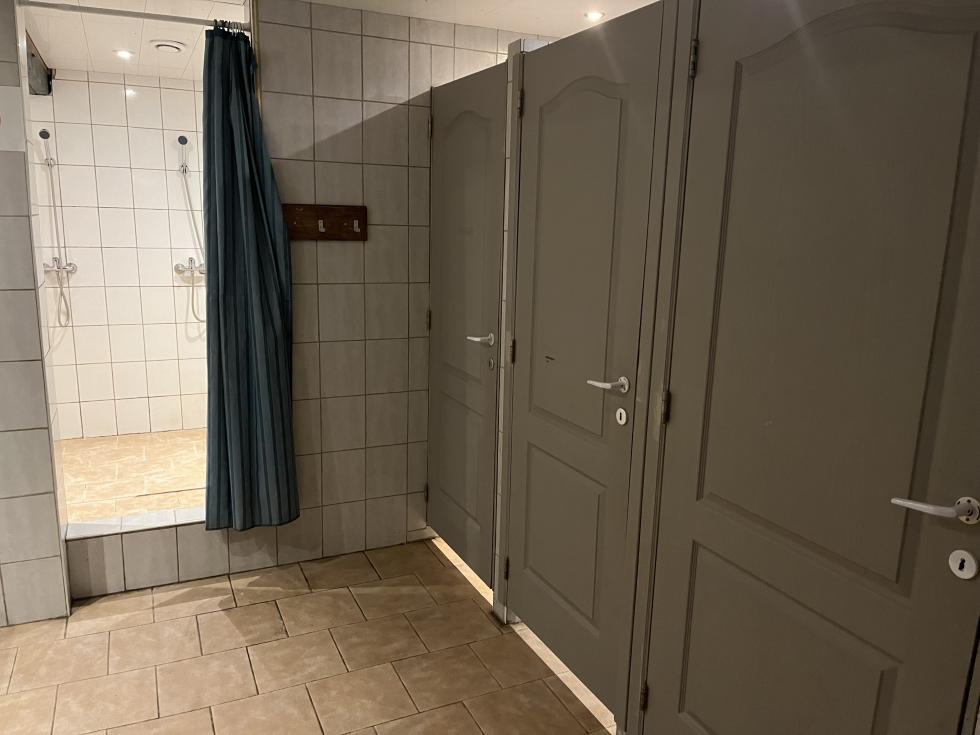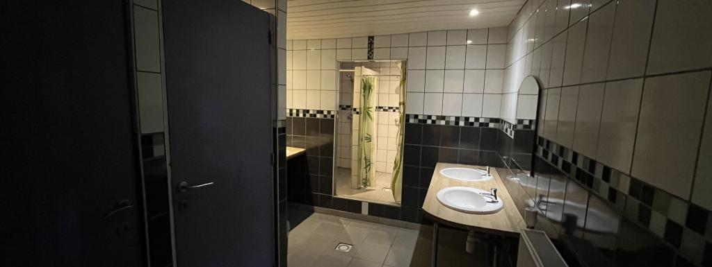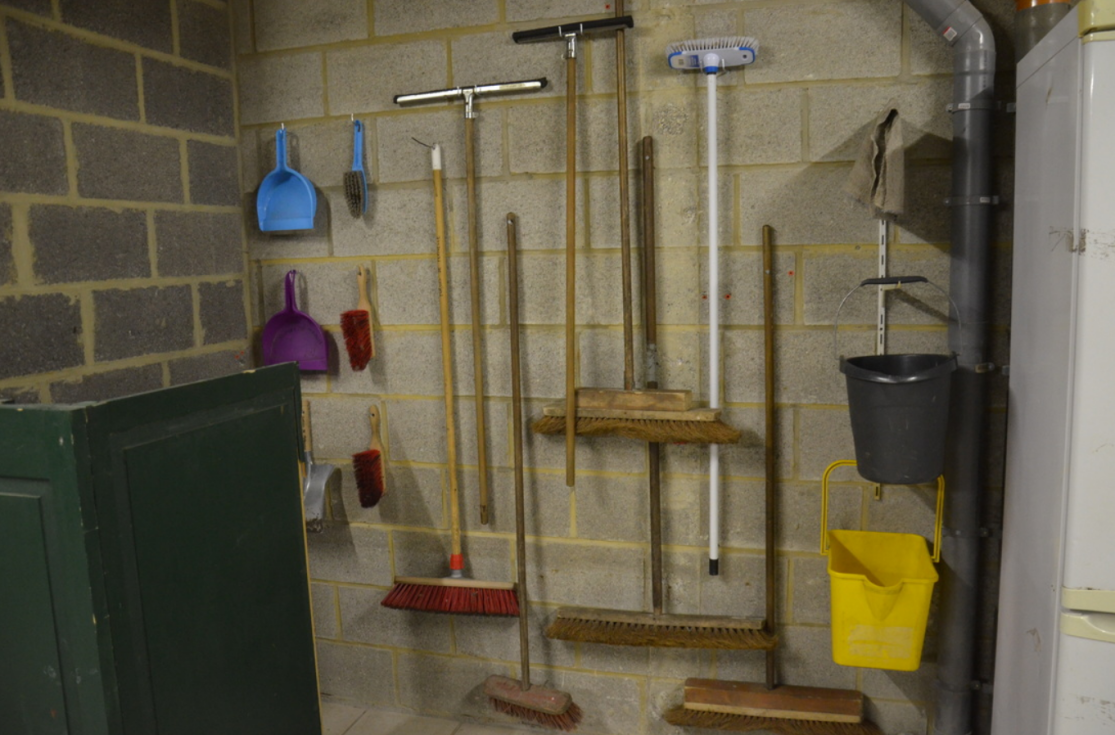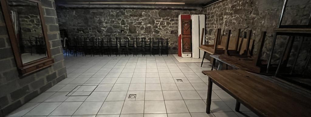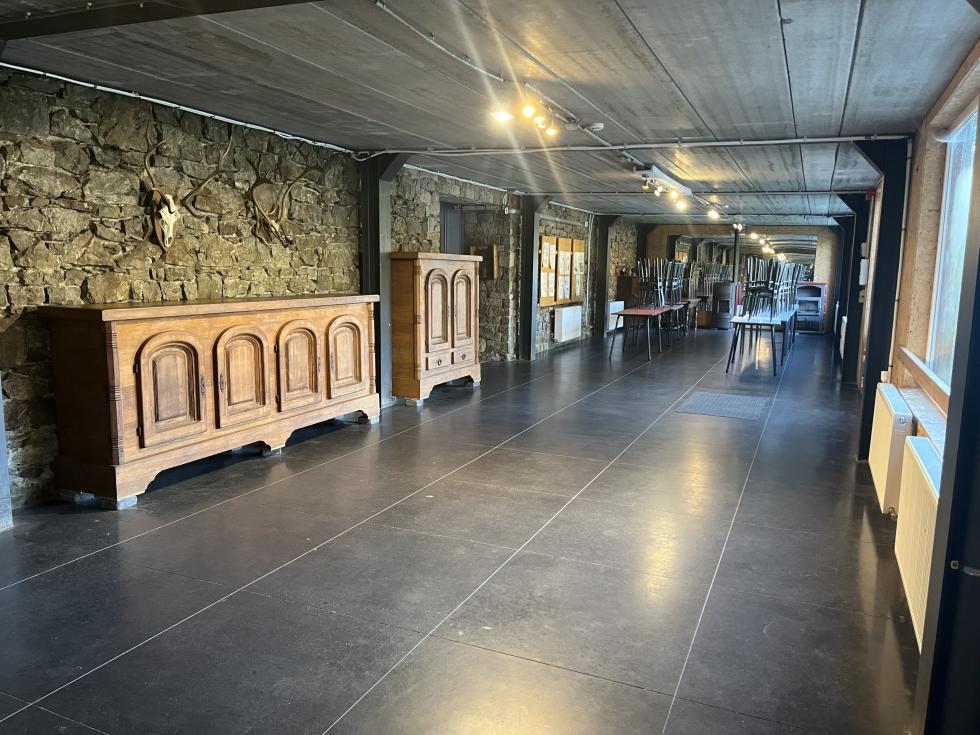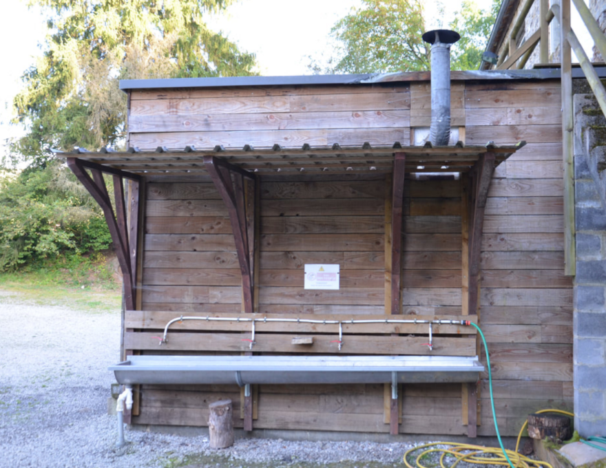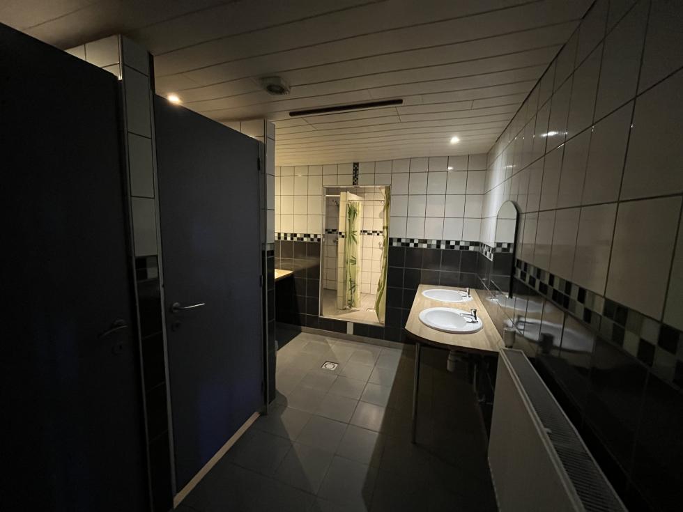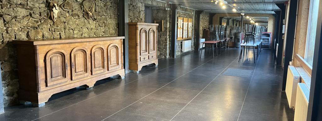 Le bâtiment : • Au rez-de-chaussée : une grande salle-réfectoire de 120 m² avec tables et chaises pour 60 personnes donnant sur le jardin ; une grande salle de 50 m² pour les chefs (malles, QG,…) et/ou pour activités d’intérieur ; une cuisine « scoute » avec 4 gros becs à gaz (pas de four, ni casseroles, ni ustensiles de cuisine!) et une cuisinière domestique, grands éviers, hotte, 2 frigos et 1 surgélateur + 3 WC et lave-mains.