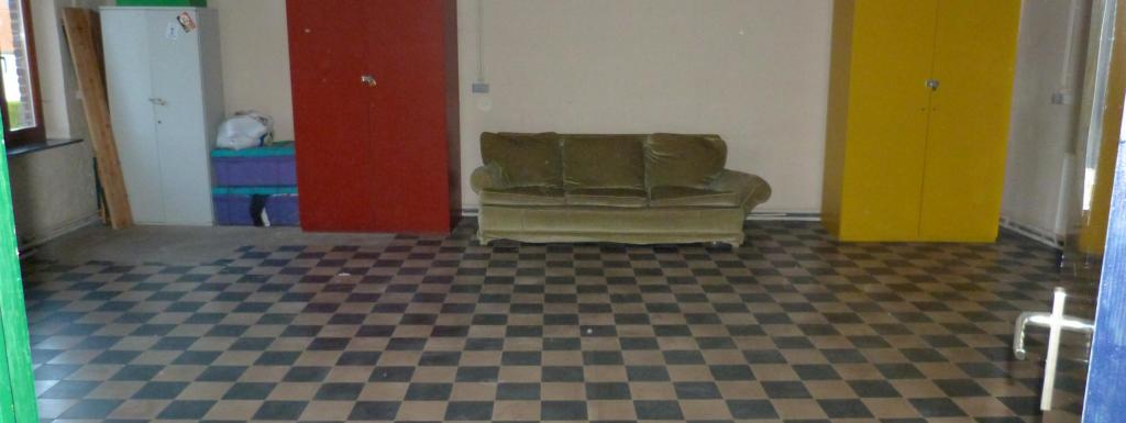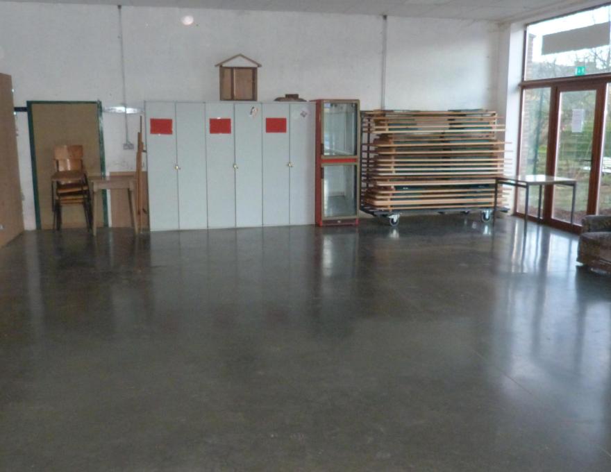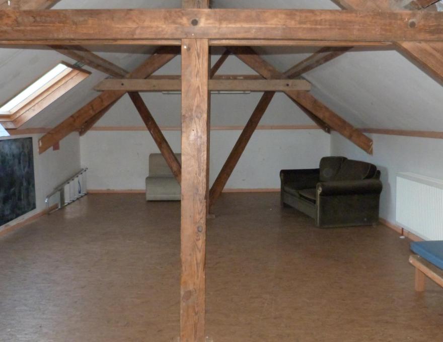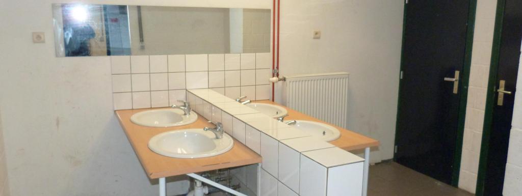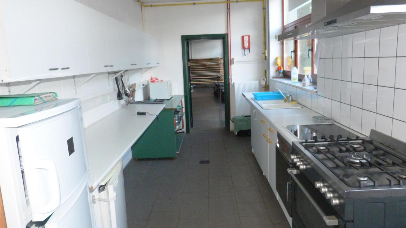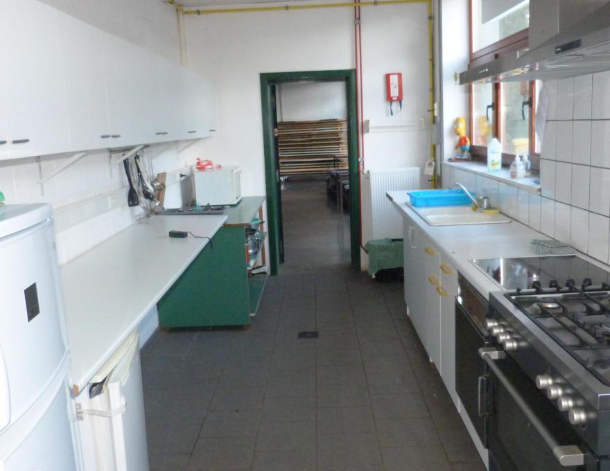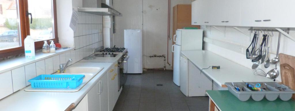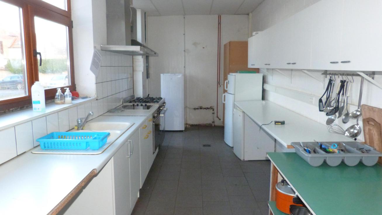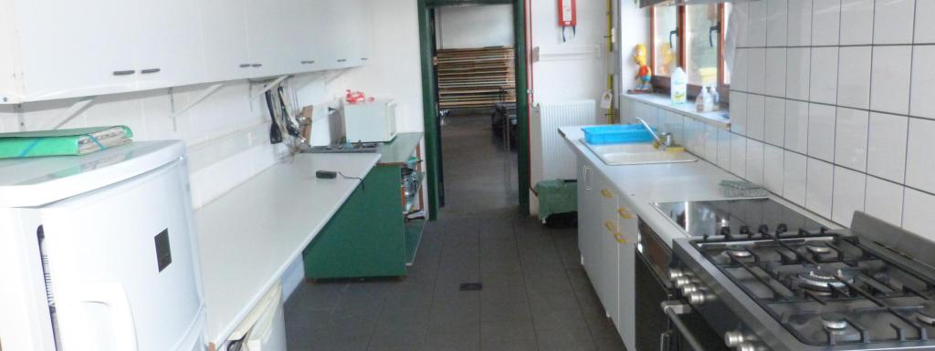 Une grande salle, cuisine, sanitaires en bas; 2 salles en haut (pas de lits).<br/>Espace libre et herbu autour des locaux permettant petits jeux.<br/> chauffage au gaz de ville.