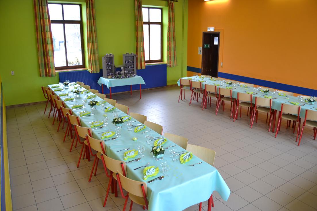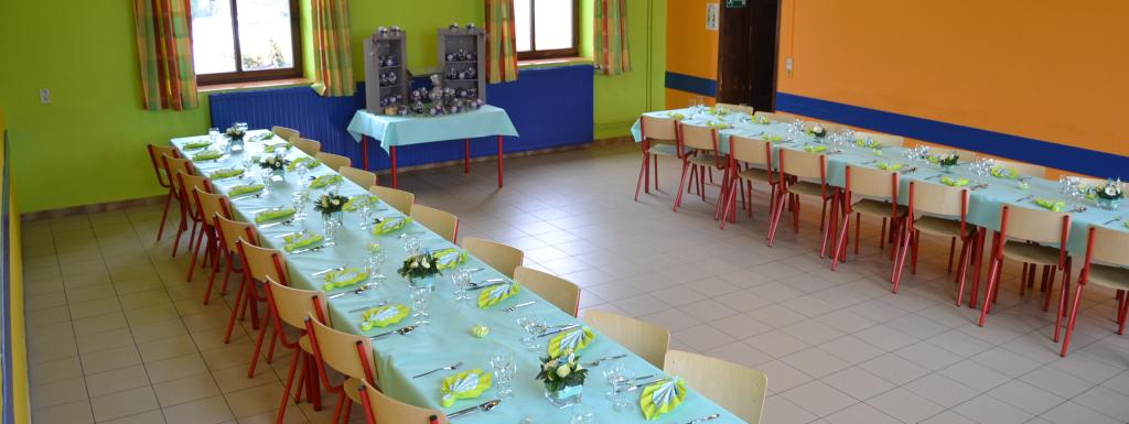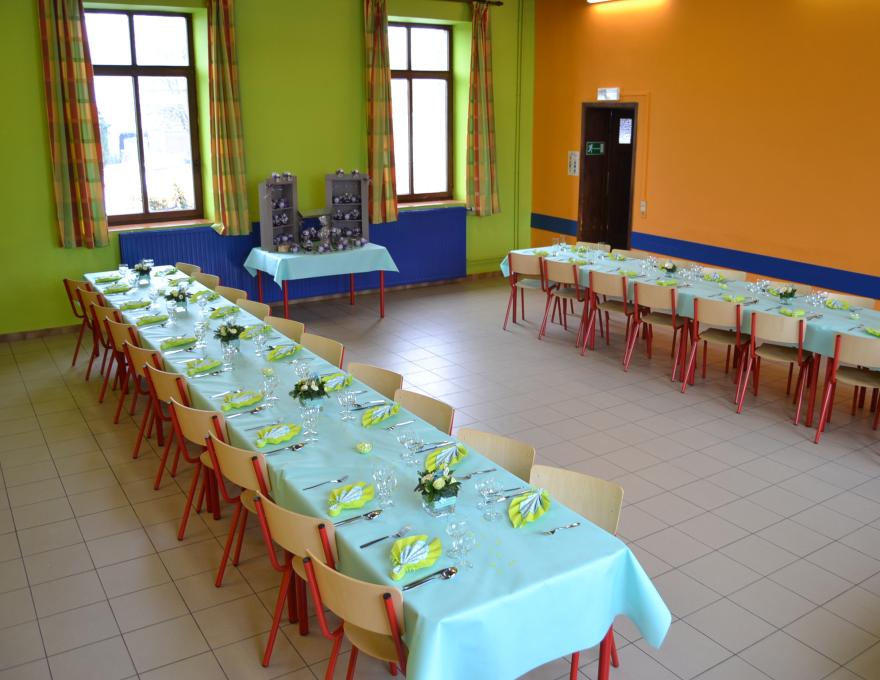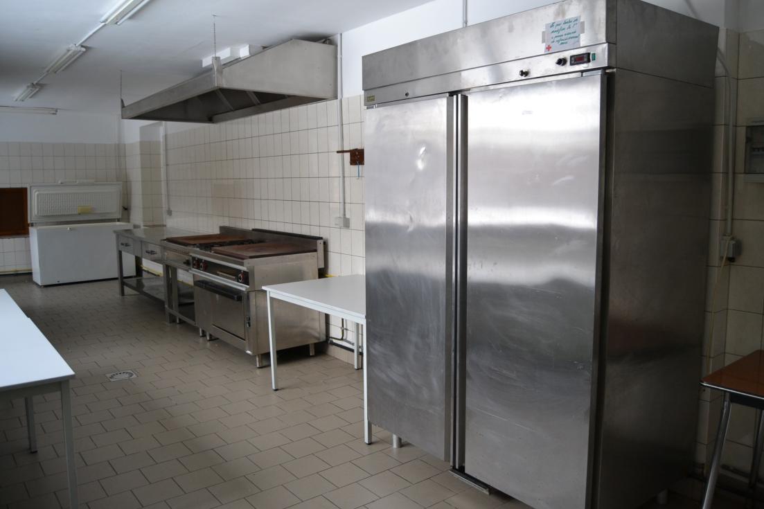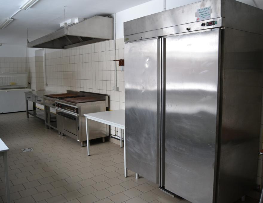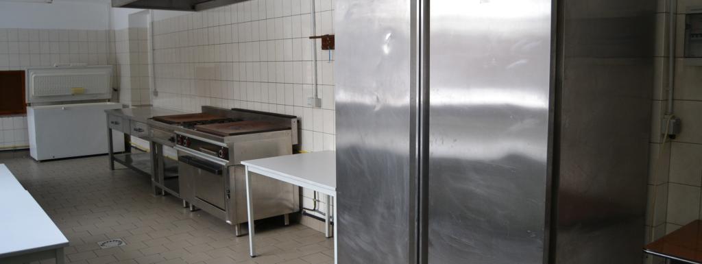 rez-de-chaussée : cuisine équipée (cuisinière avec fours, frigo, congélateur, éviers) + réfectoire au rez-de-chaussée + sanitaire (WC, éviers, douches)
