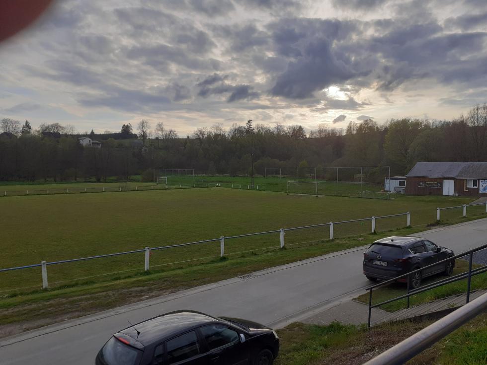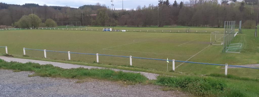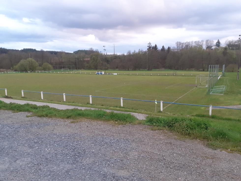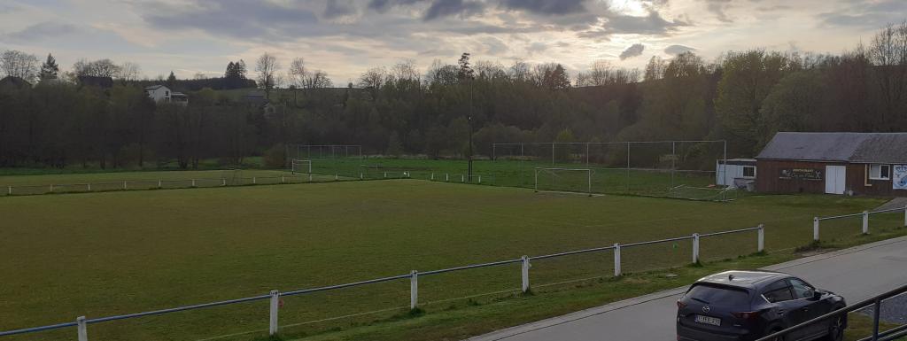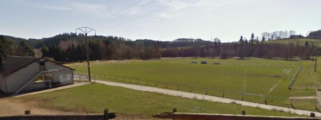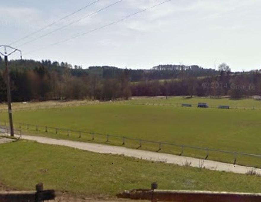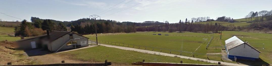 Prairie de 70ares pour tentes et endroit de feu avec rivière accessible. Accès au terrain B de football.
