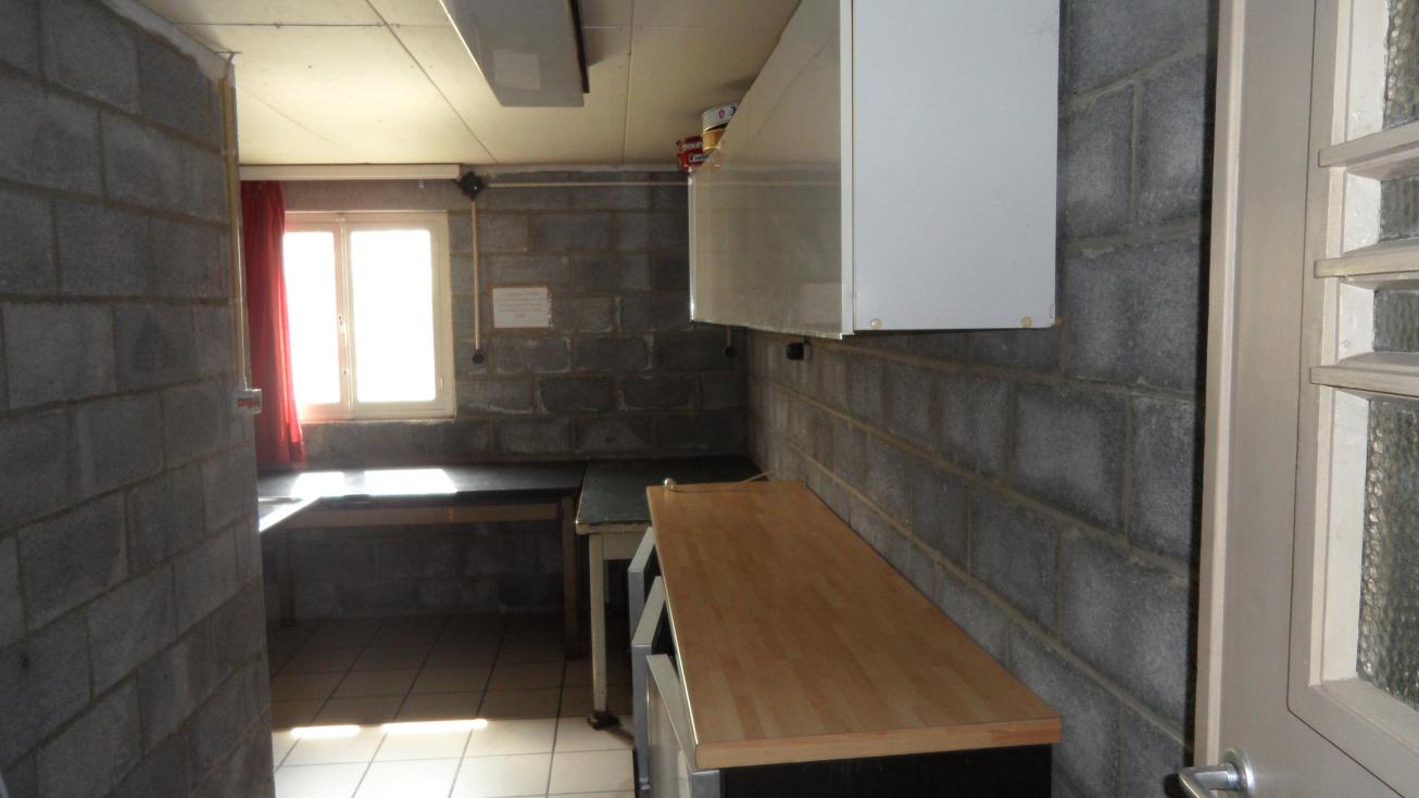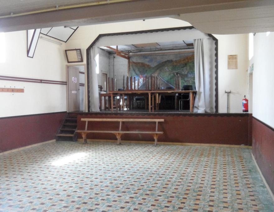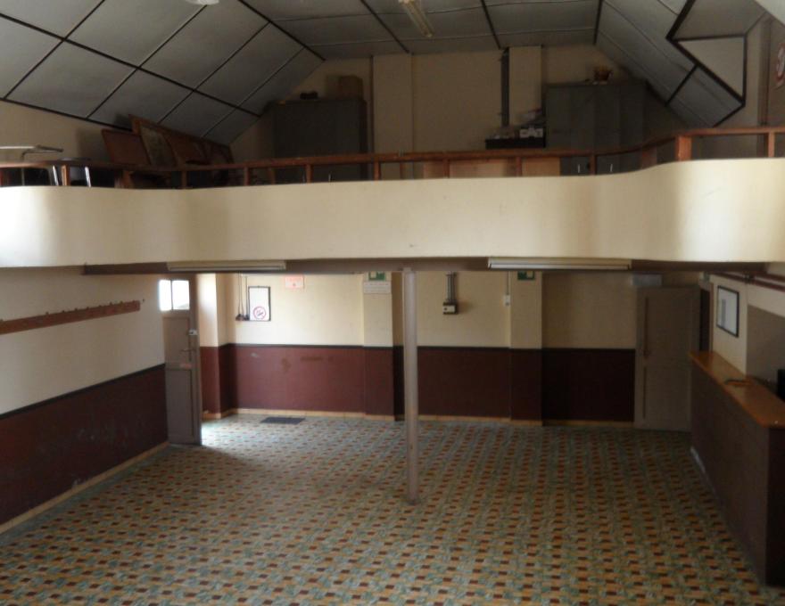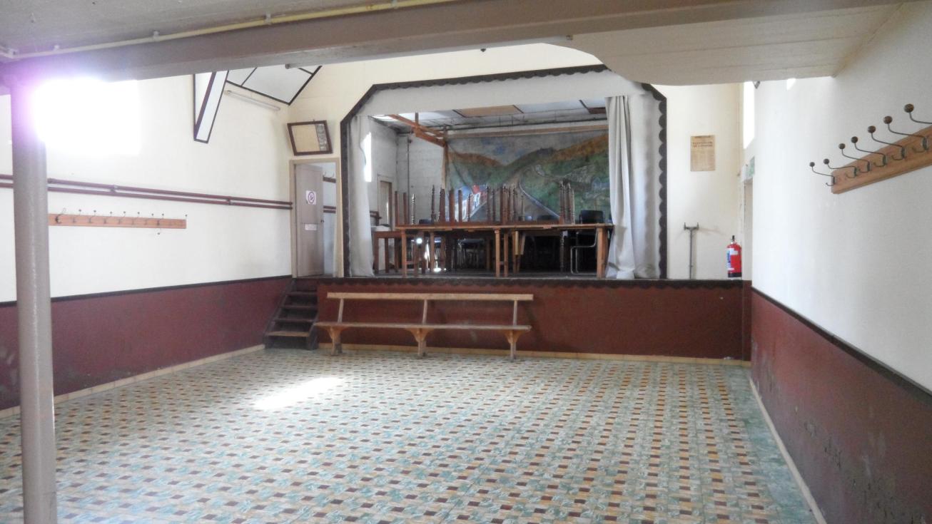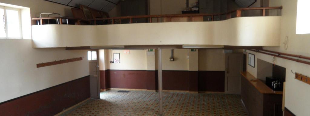 Elle est composée d'une pièce carrelée (10m X 7m), d'une scène avec un plancher en bois (5m X 7m), d'une cuisine avec frigos, cuisinière au gaz, évier, armoires, chauffe-eau, de wc hommes, wc femmes, d'une mezzanine de 4m x7m.