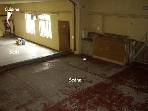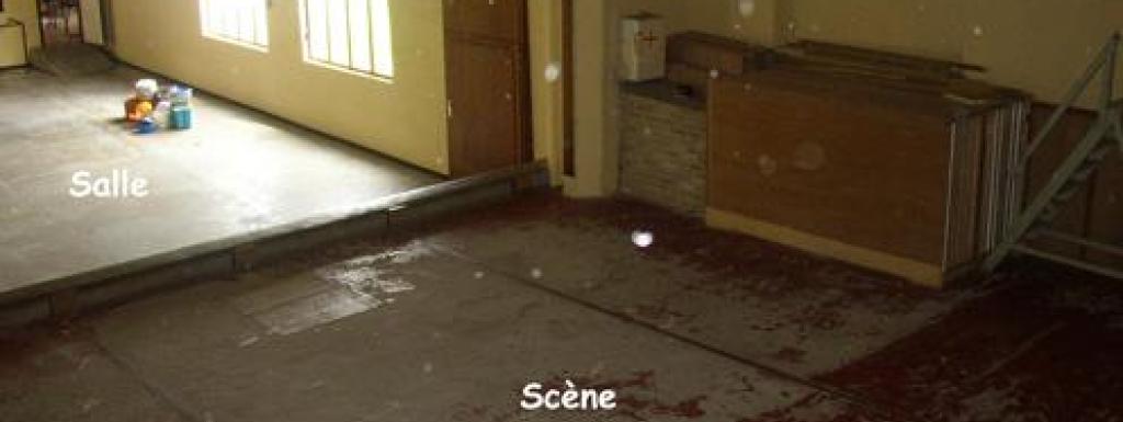 une salle de spectacle avec une scène (souvent dortoir des enfants),