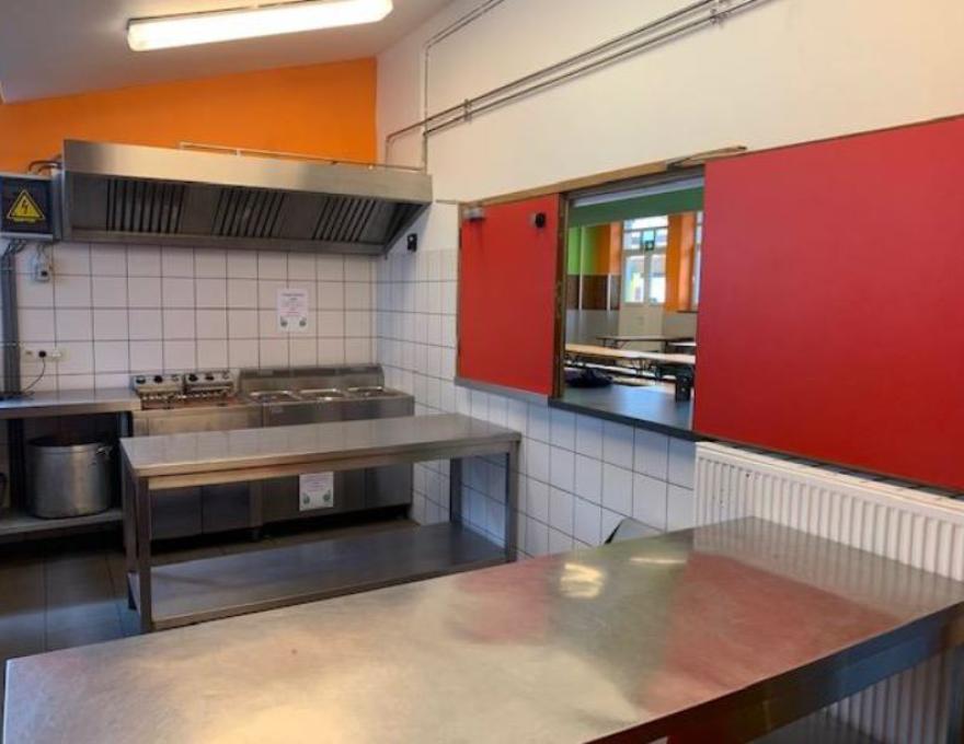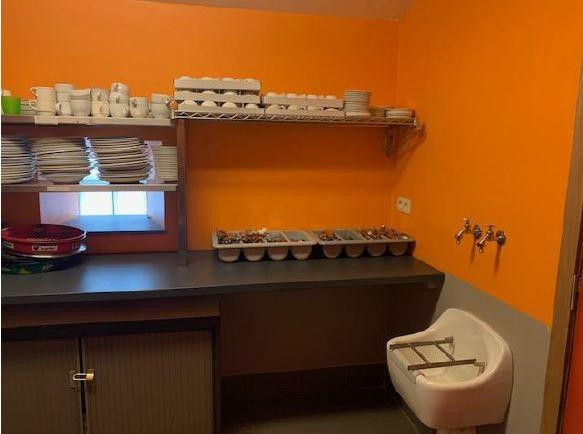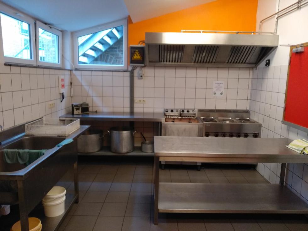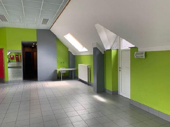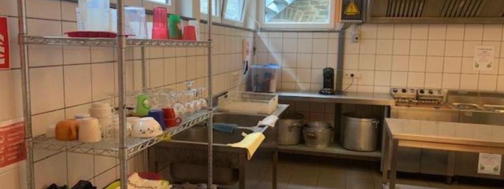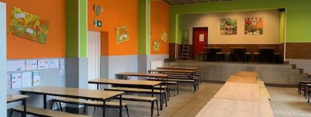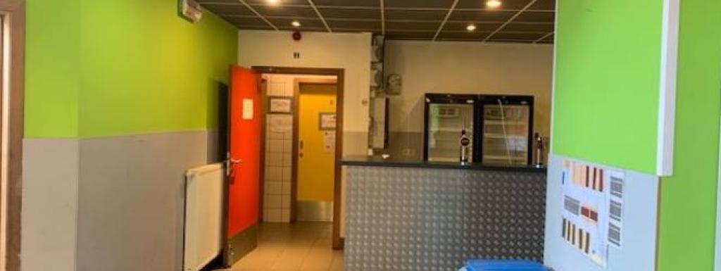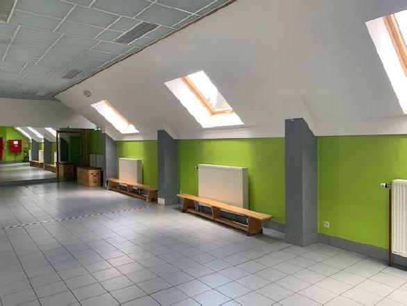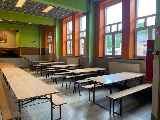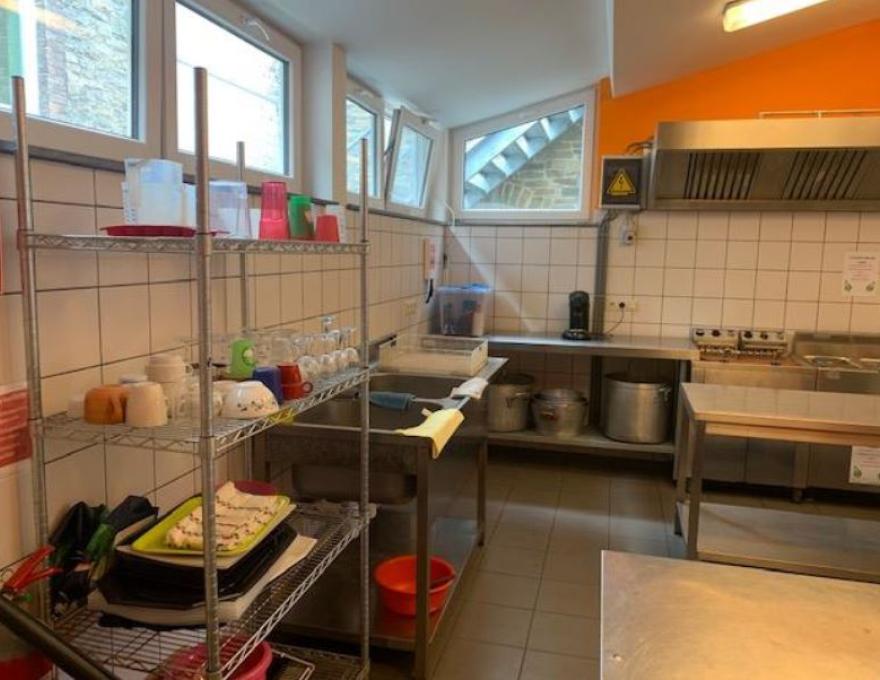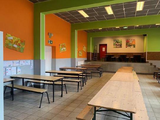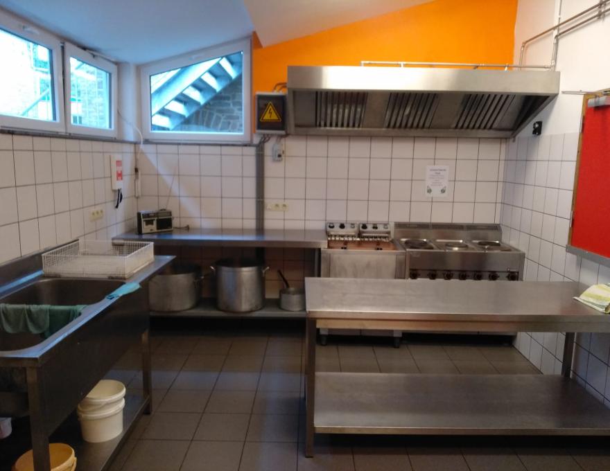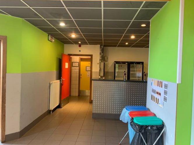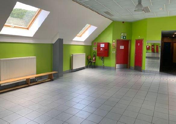 Rez: réfectoire - scène - comptoir - cuisine équipée - arrière cuisine avec chambre froide - réserve - toilettes (5 wc+urinoirs)