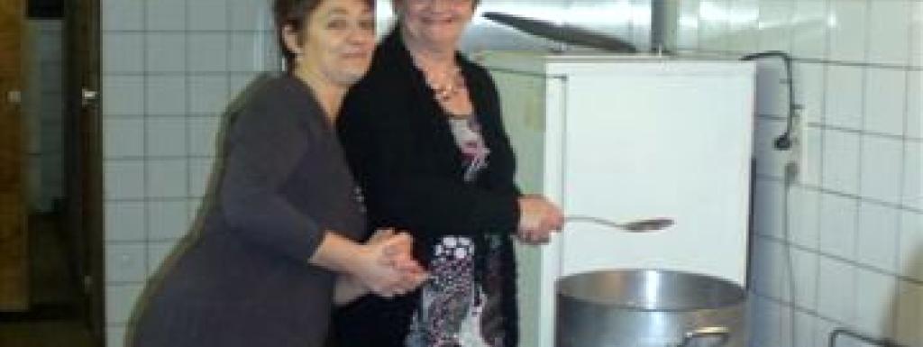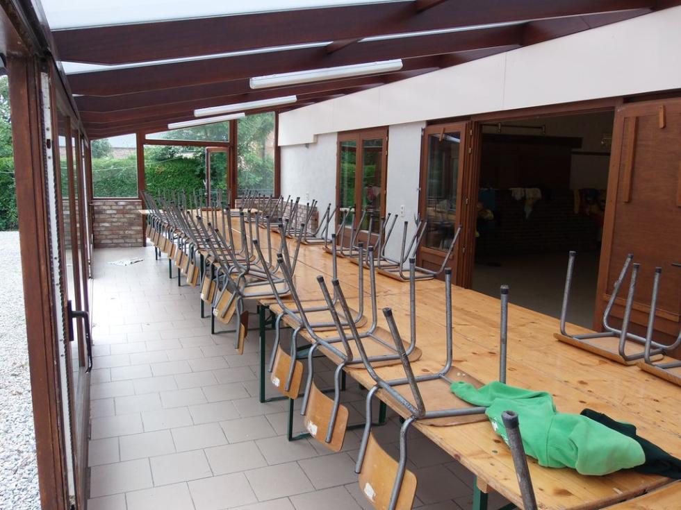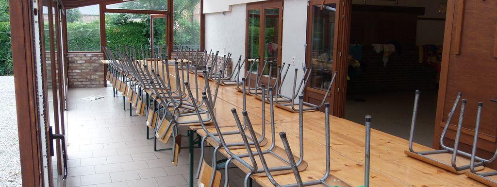Tables et chaises à volonté. Matériel de nettoyage. Chauffage central mazout.