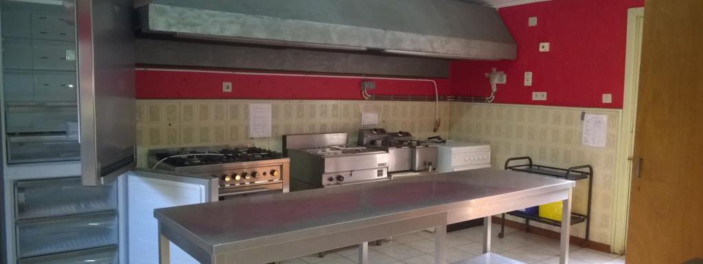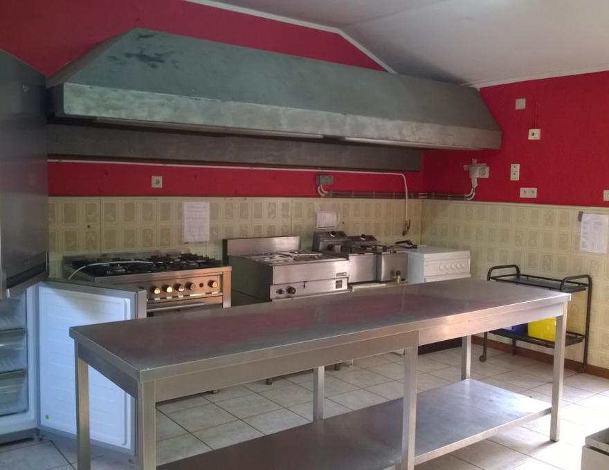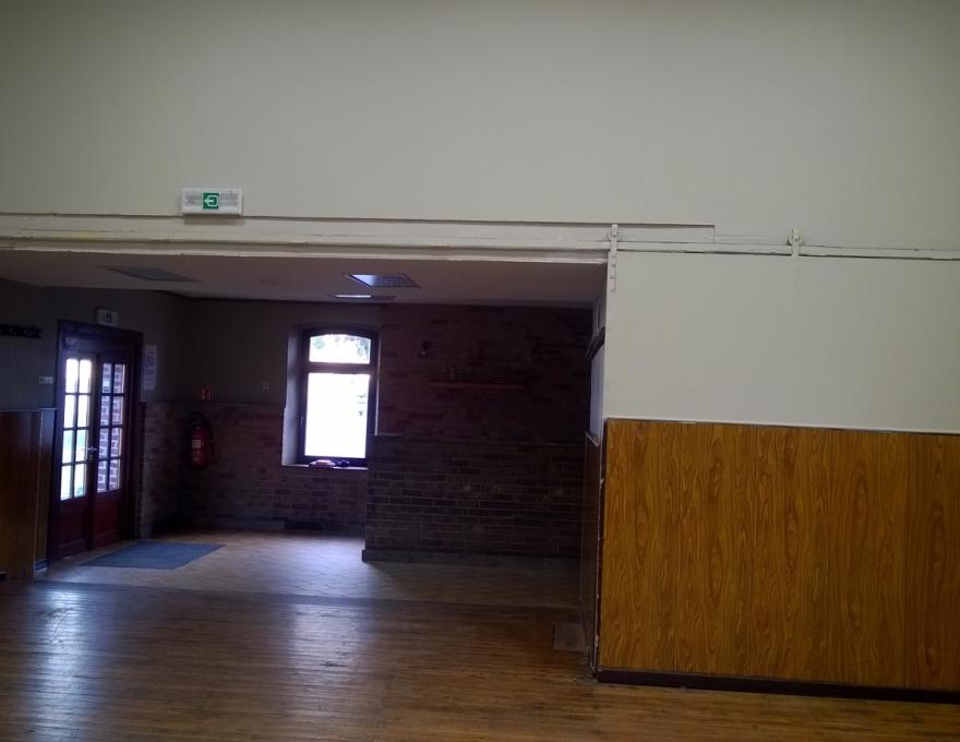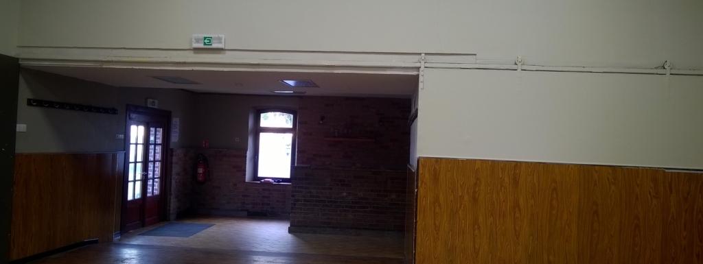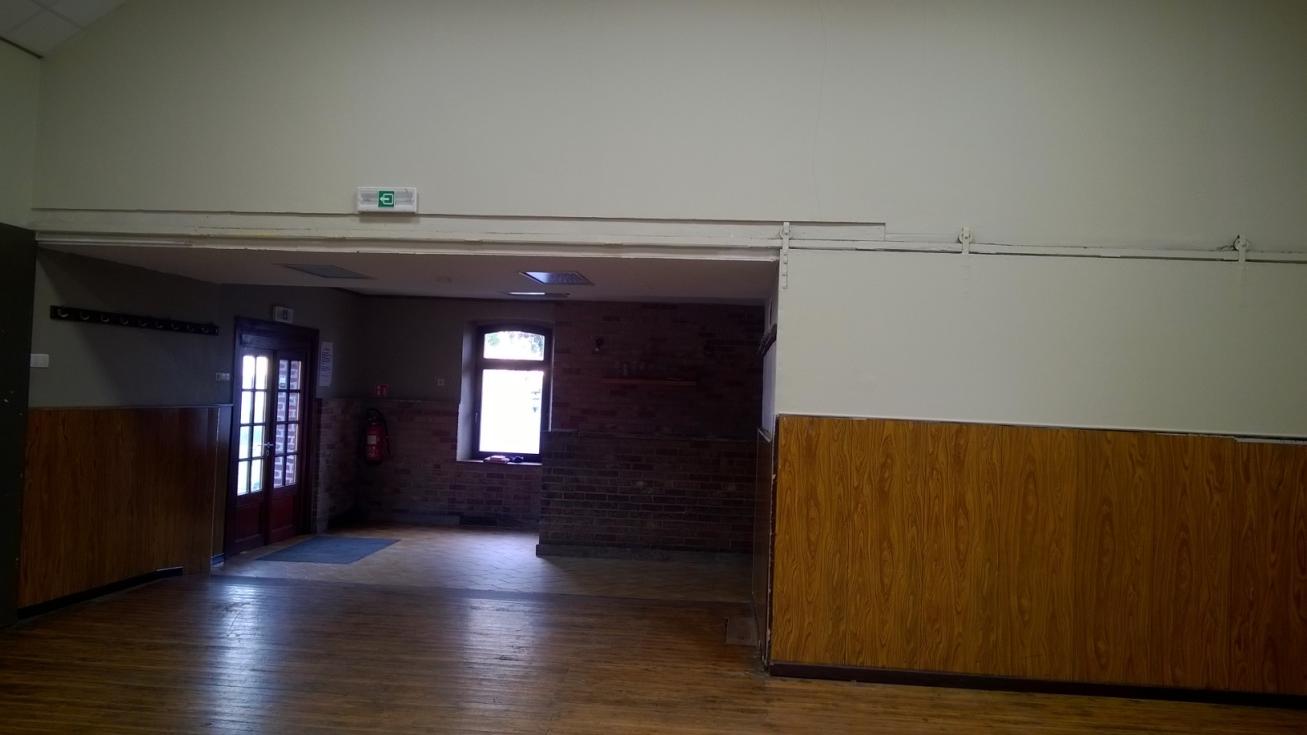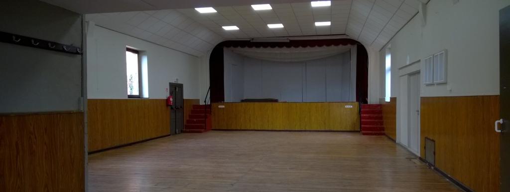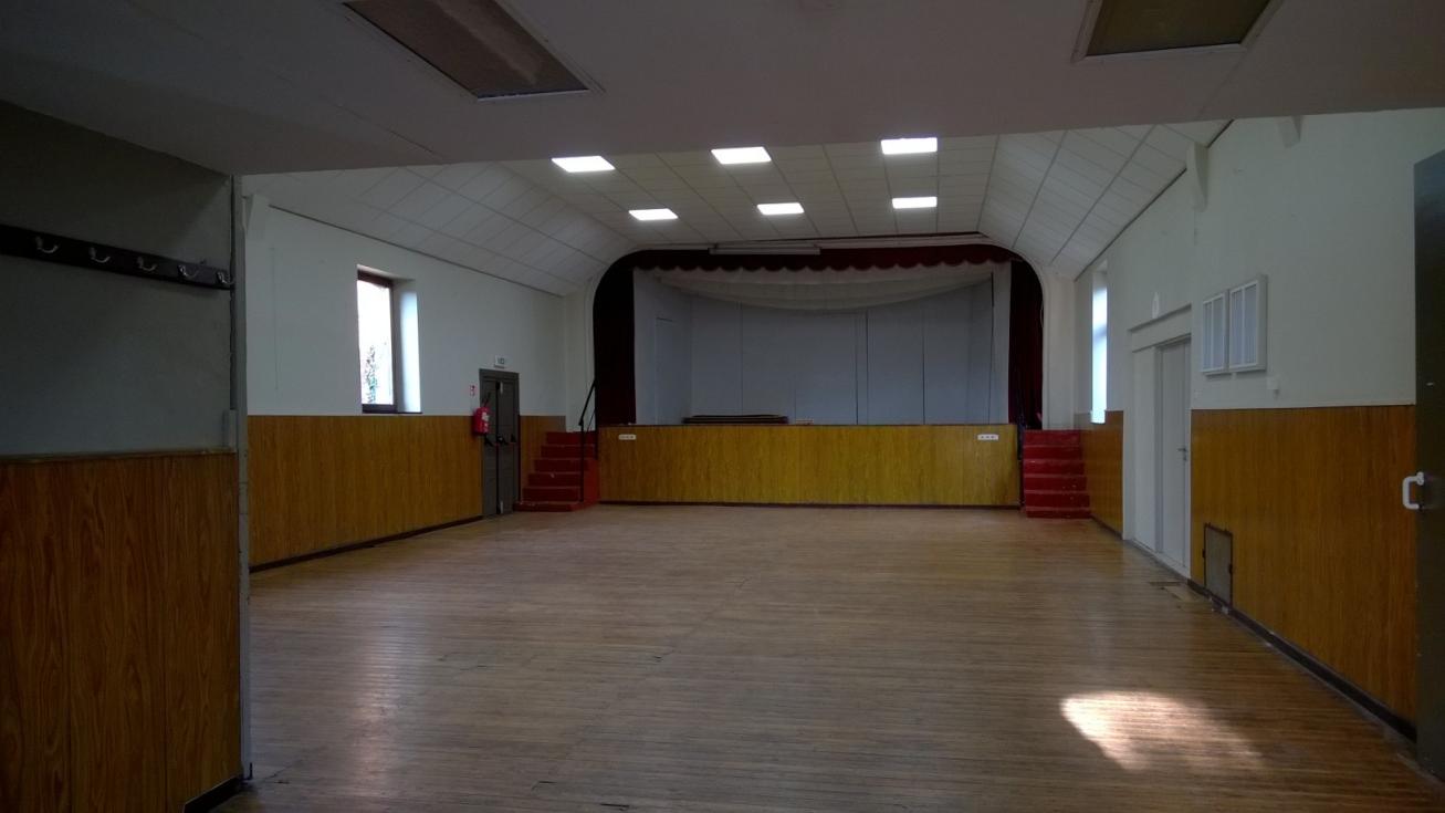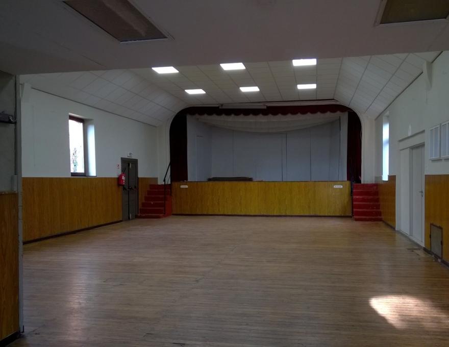Salle de village composée d'une grande pièce avec une scène et un coin bar, ainsi que des toilettes adjacentes . L'étage comporte un local pouvant servir pour le staff.