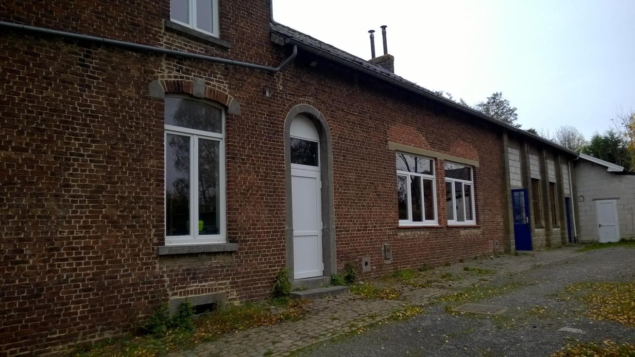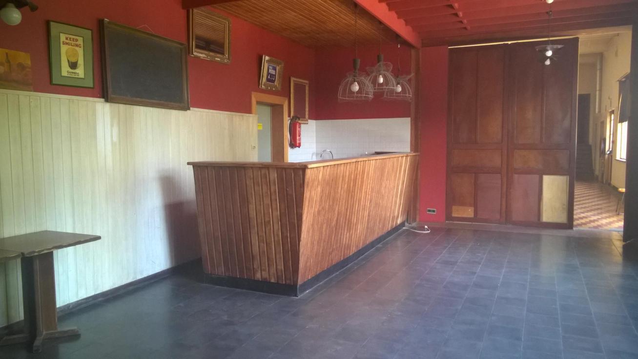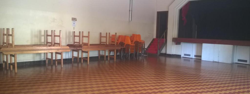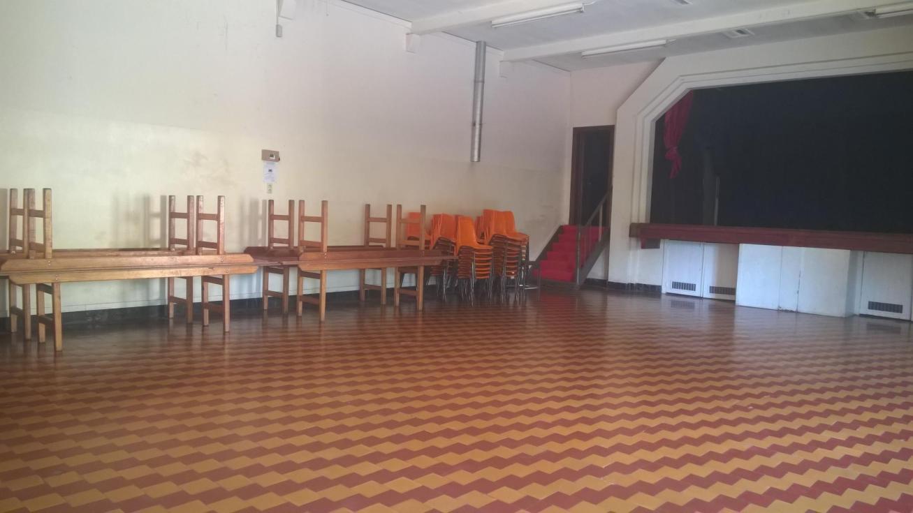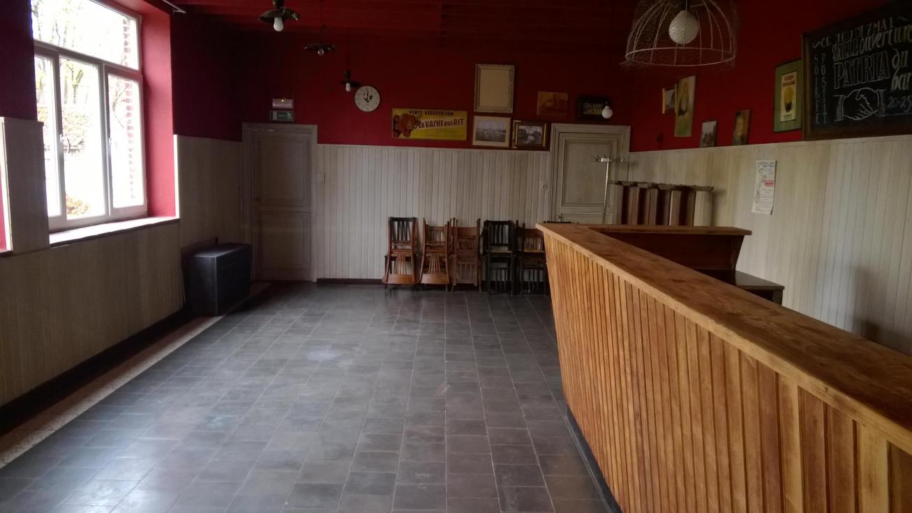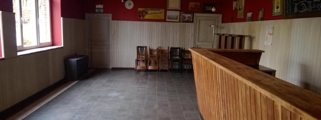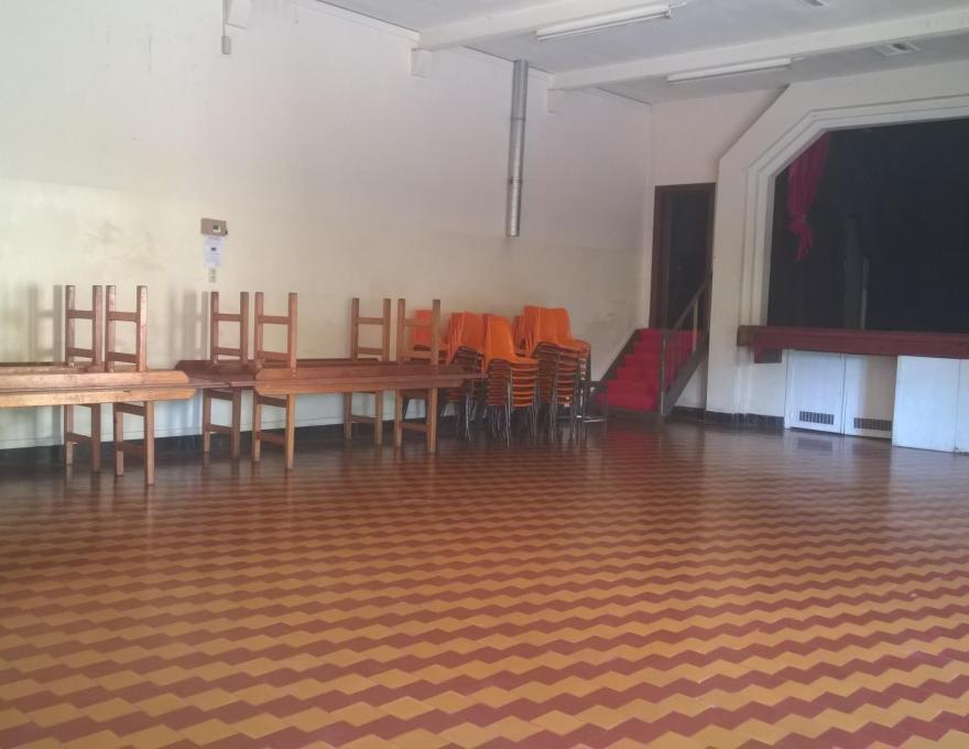 salle de 150 m² à laquelle sont annexés un bar, une cuisine, une scène et des toilettes. Prairie d'environ 4 ares attenante