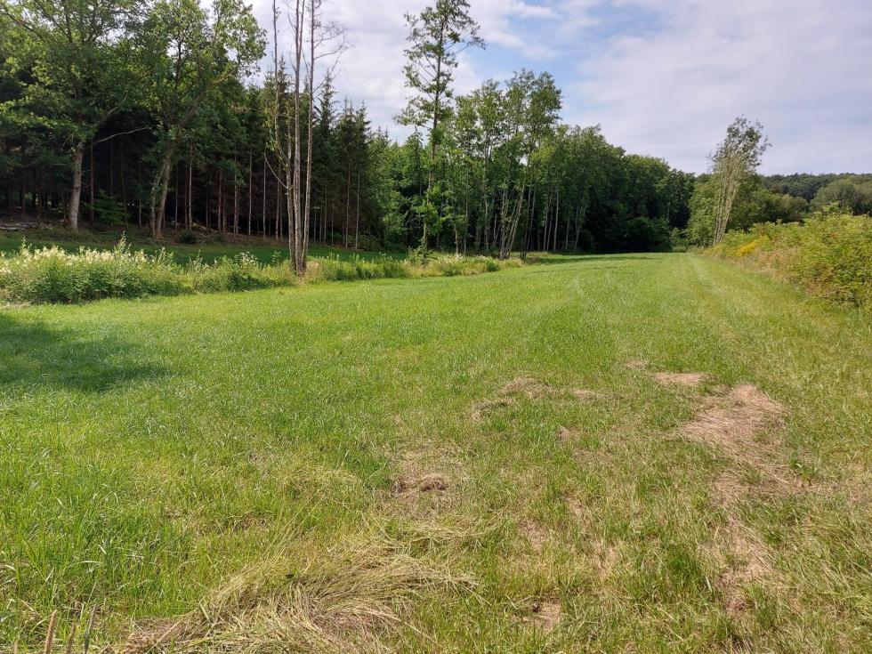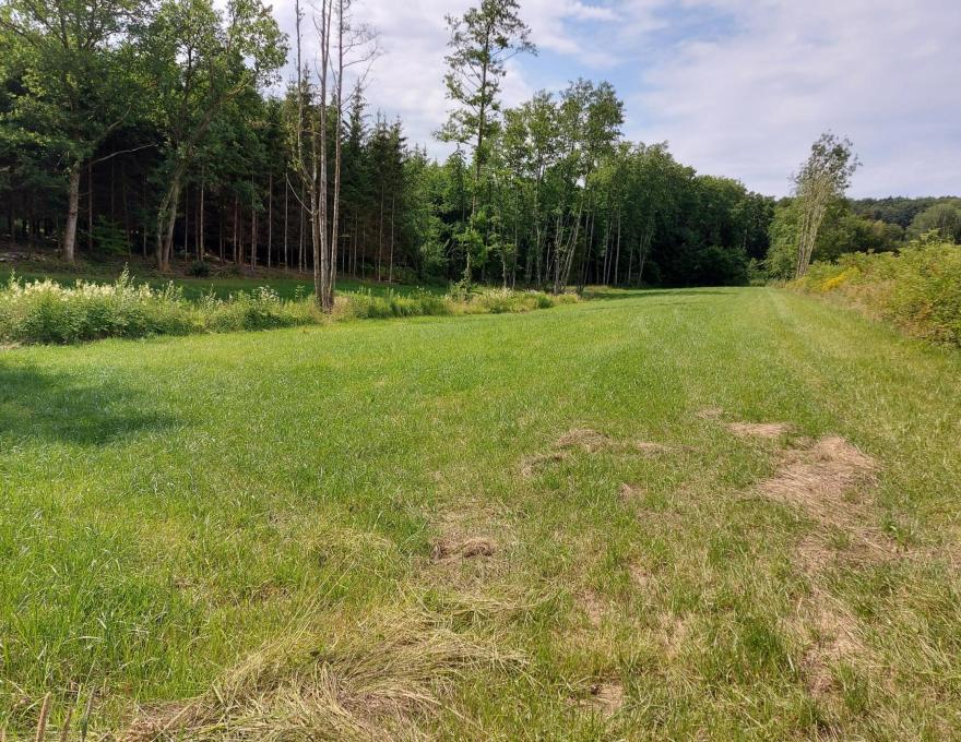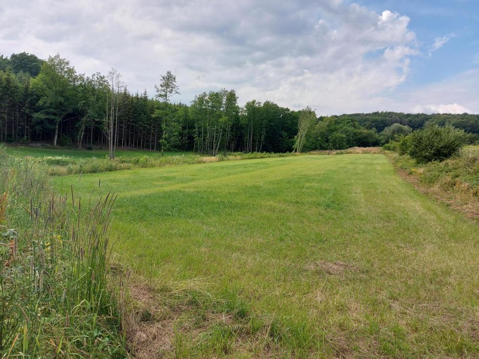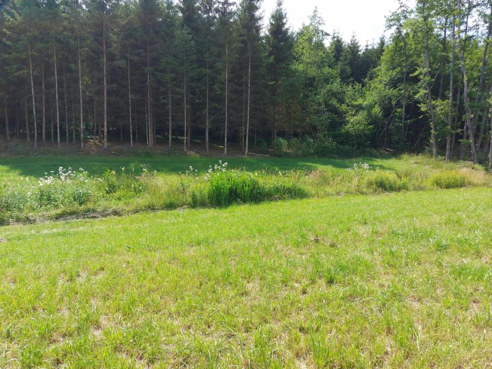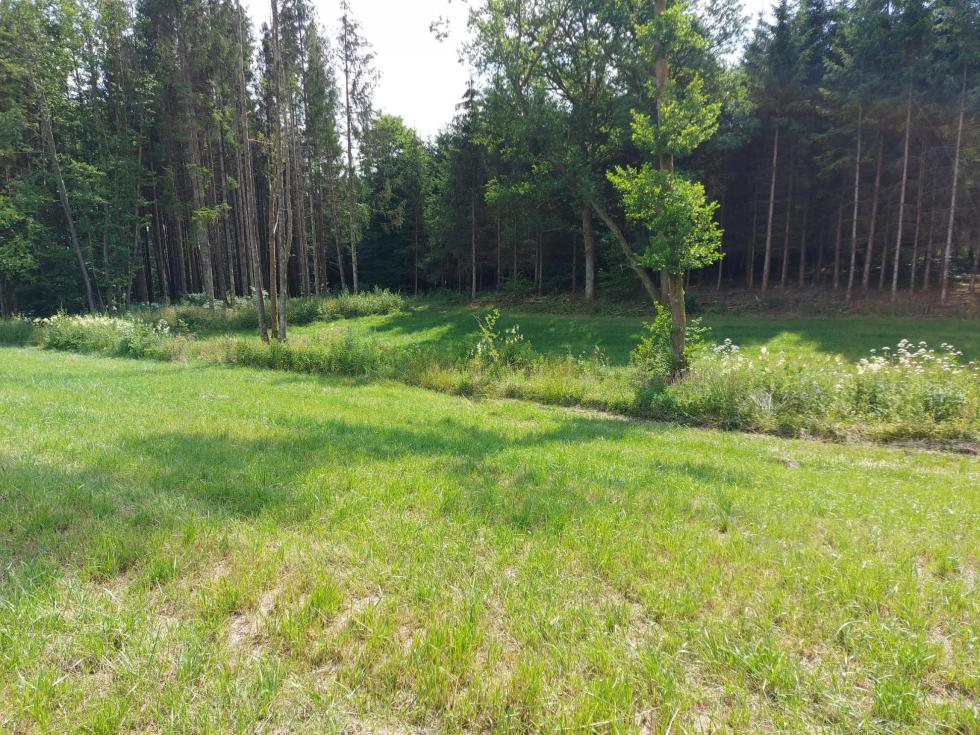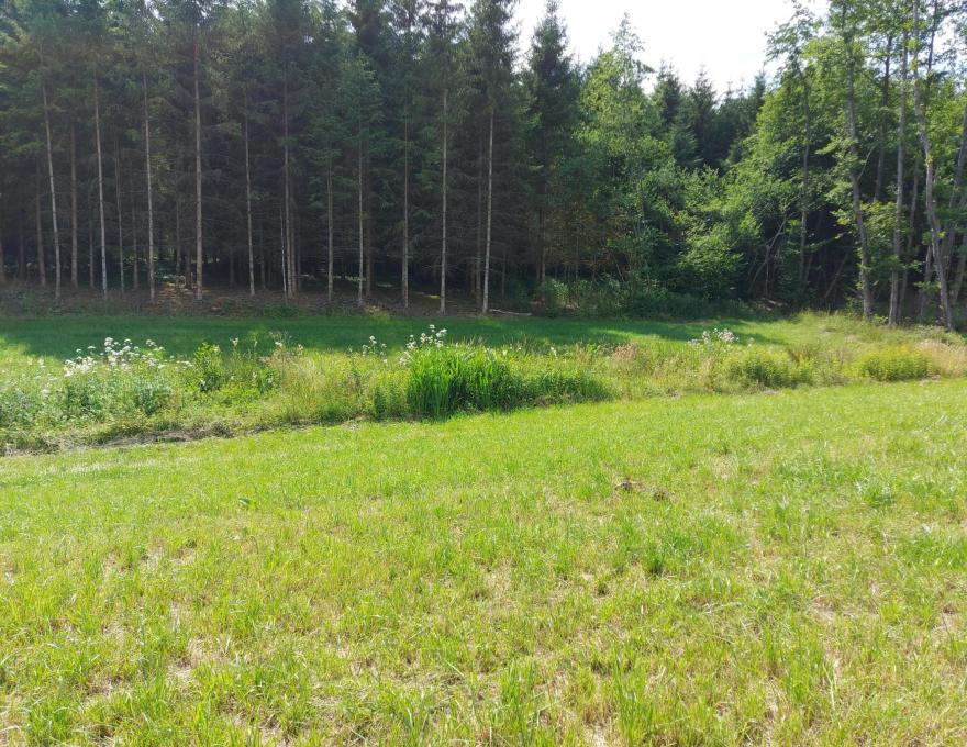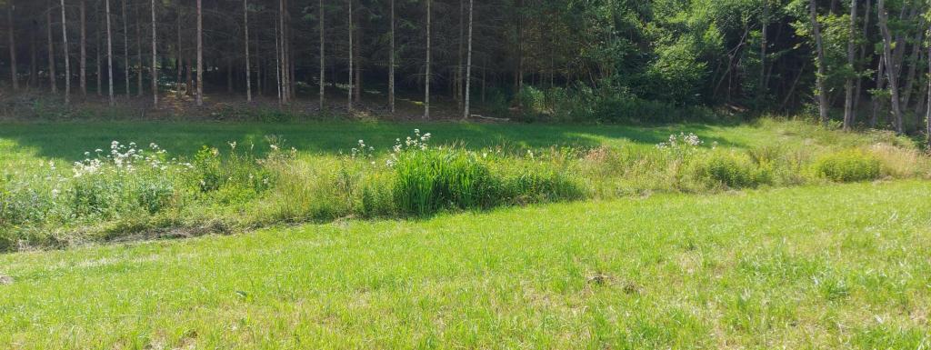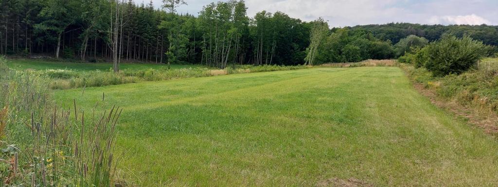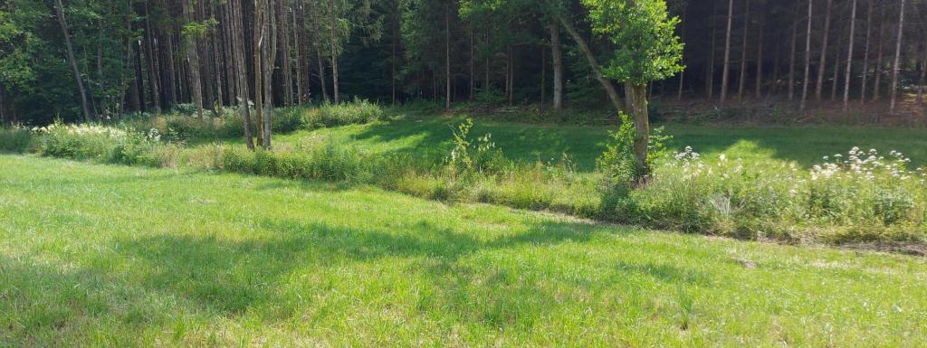 Prairie au creux d'un petit vallon, séparée en deux parties par un petit ruisseau. Entouré essentiellement par des bois.