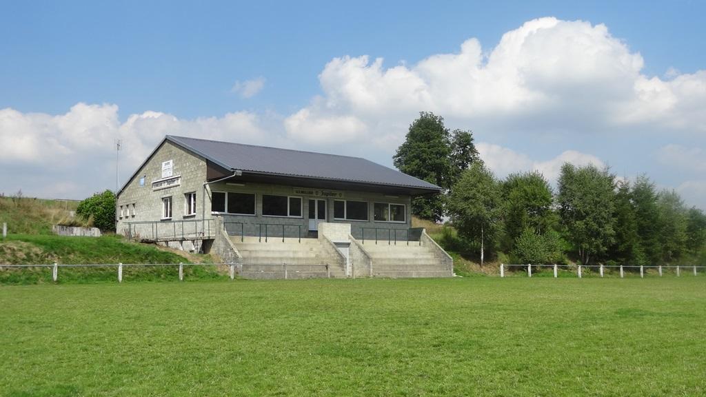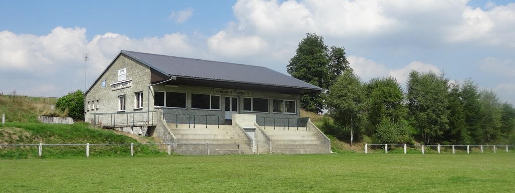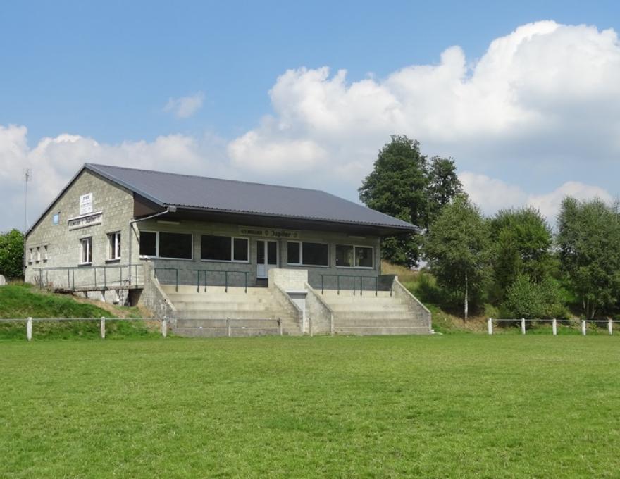 Cafétariat d'un club de football, cuisine, vestiaires, douches, terrain de sport.